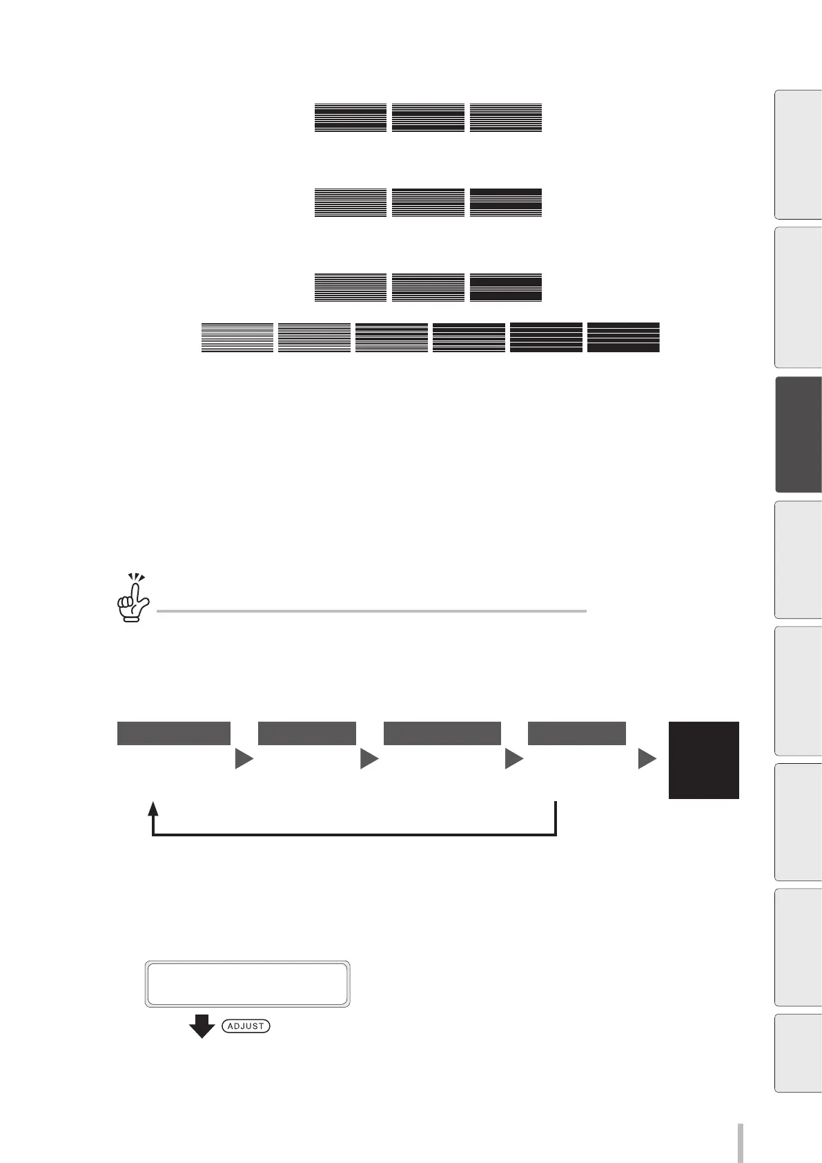 With 3 patterns, the printer prints three media advance adjustment patterns, one with the set adjustment value, one