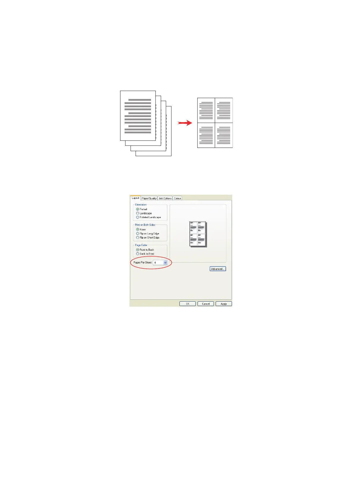 In the driver’s Layout tab, choose the number of pages (N-up) you want to print on each