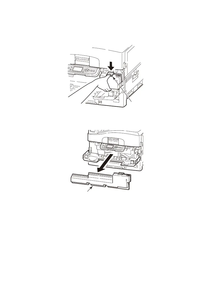 3. While pushing the blue lock (3) of the waste toner box, pull