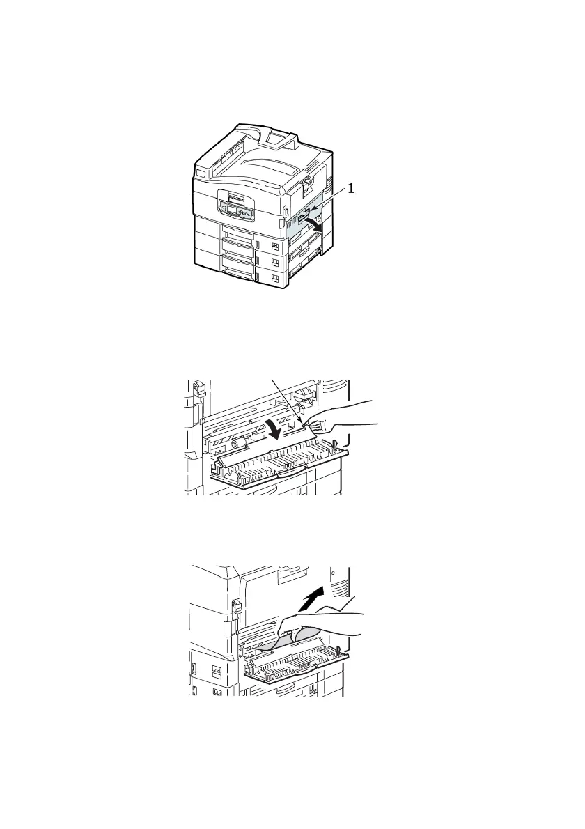 1. Squeeze the catch (1) on Tray 1 side cover and open the