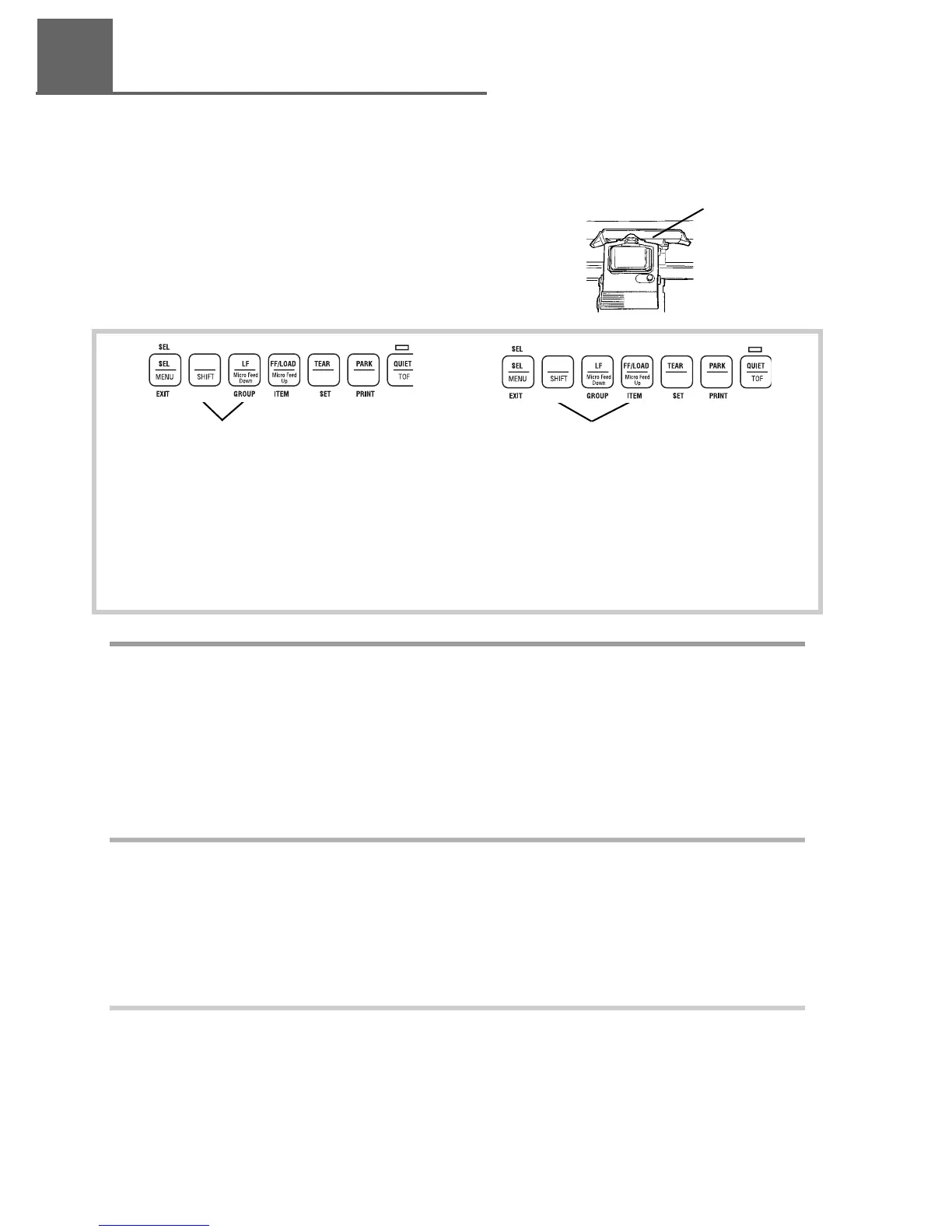 Make sure the printer is deselected (SEL light off—press the SEL button to deselect). To set the Top of Form (the