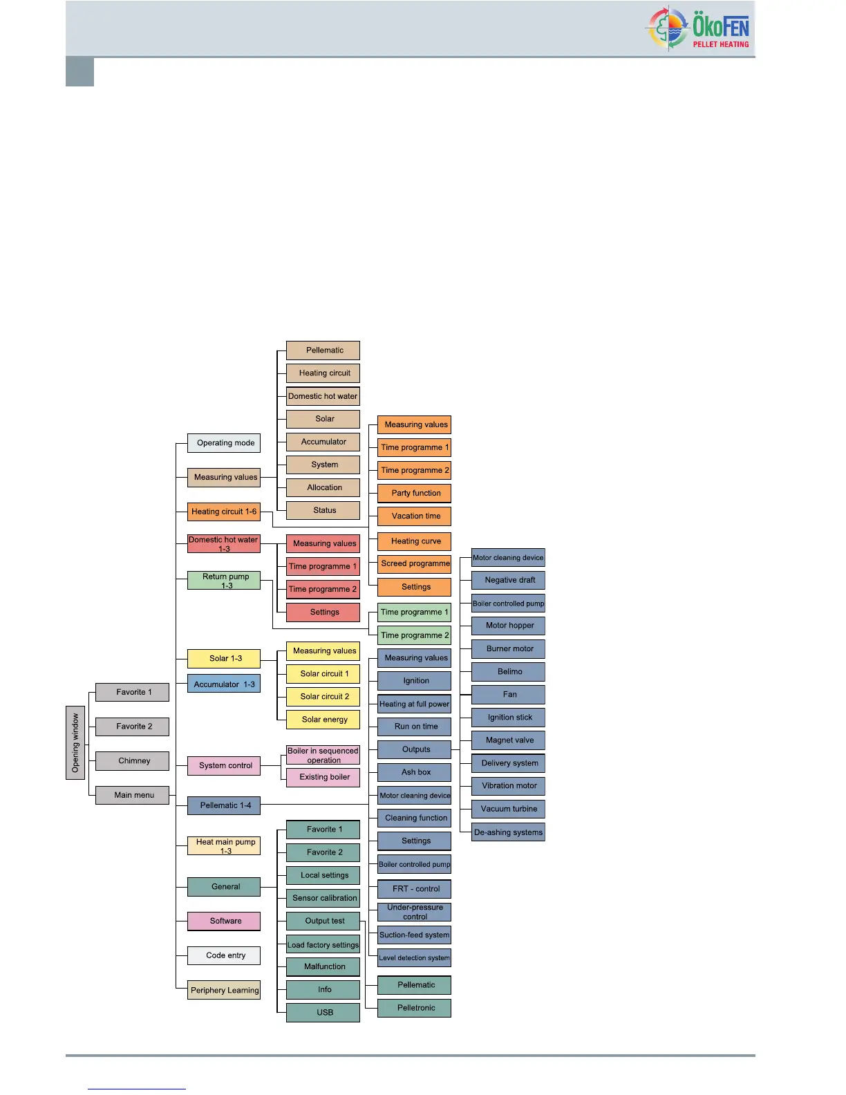 MenuguideshowsthemenulevelsandmenuitemsofthePelletronicheatingcontrollerwiththeadditional