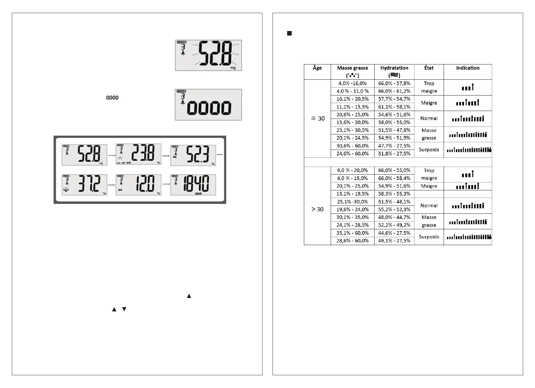 Les mesures s'affichent dans l'ordre suivant: masse de graisse(ici: