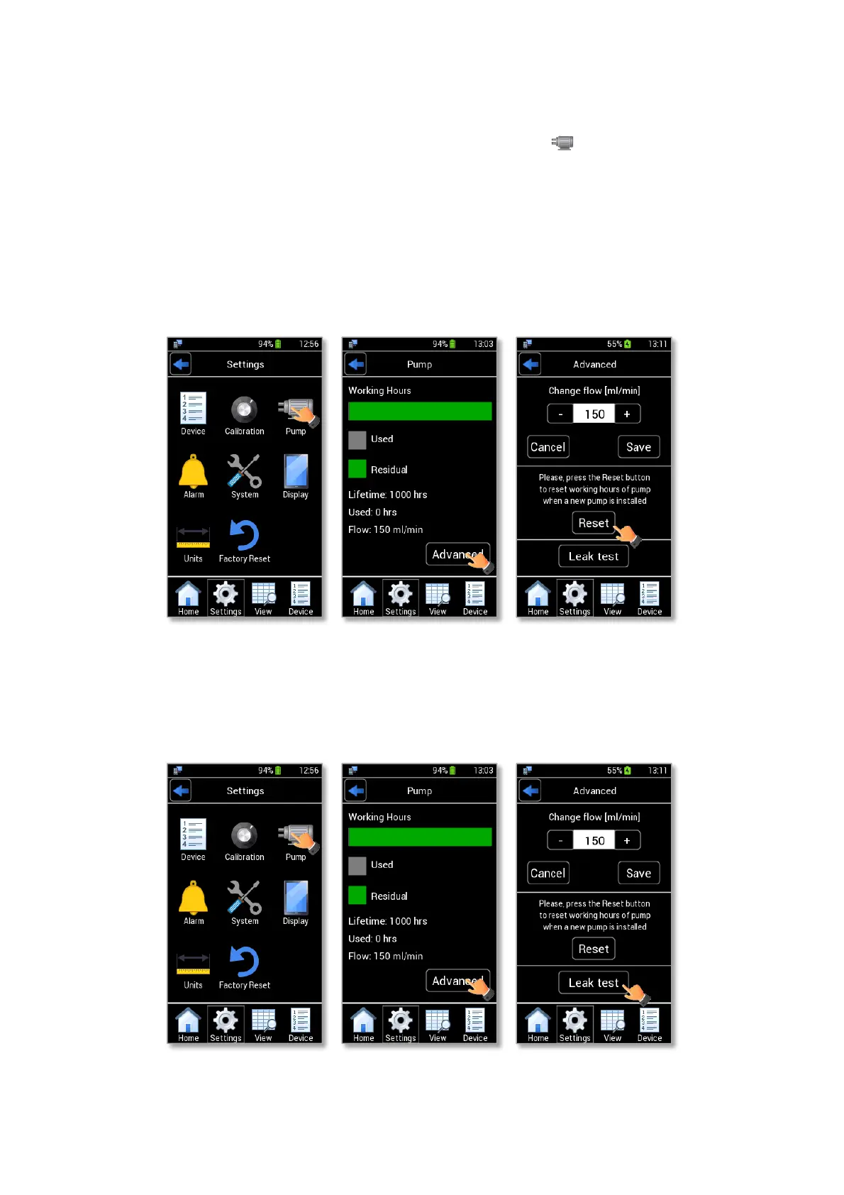 Figure 24 shows the internal pump subpages. By pressing Pump icon (see Figure 24 a), you can read