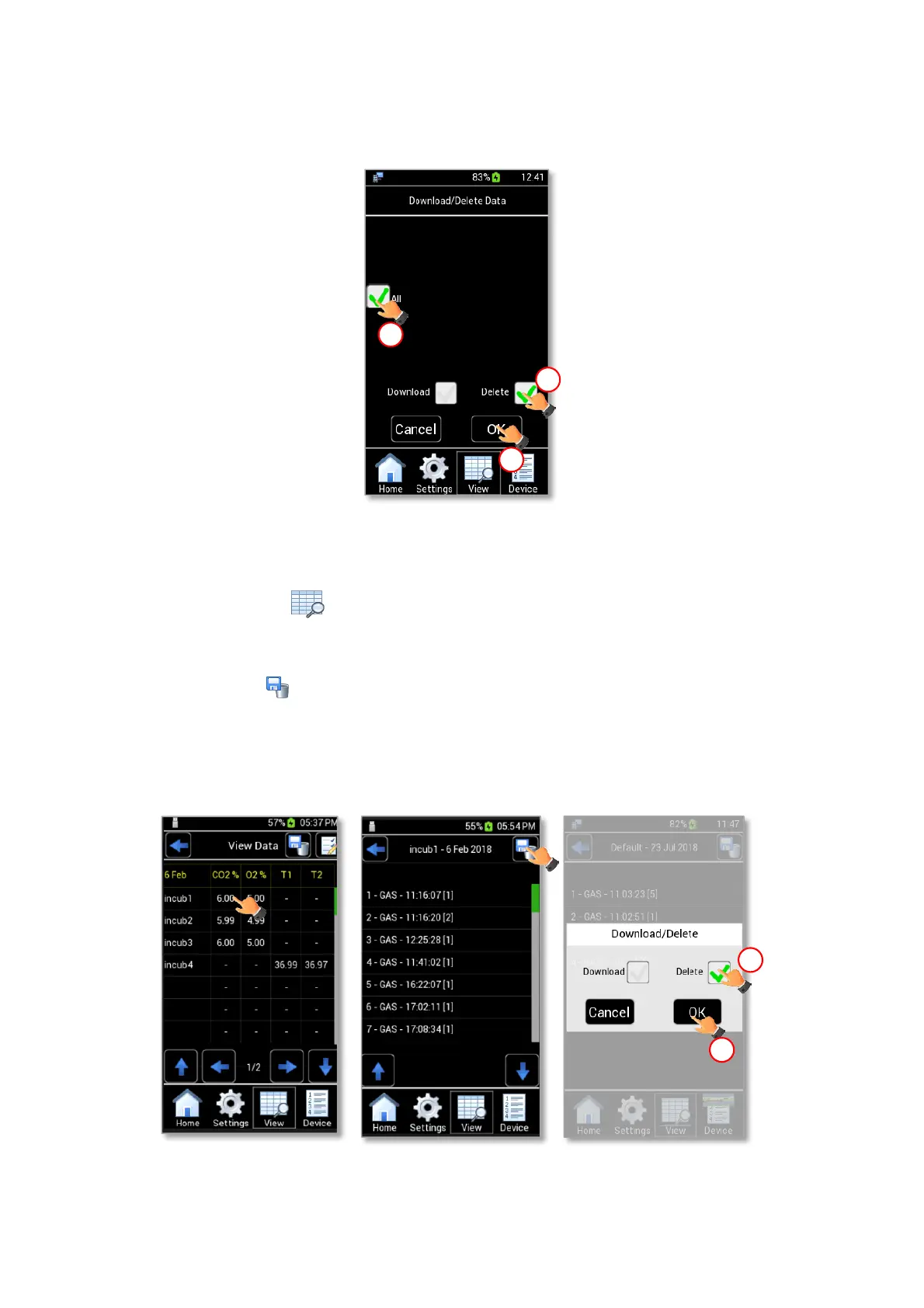 4. Enable the Delete check box (1 in Figure 72 c) and then press OK to download the selected data to the