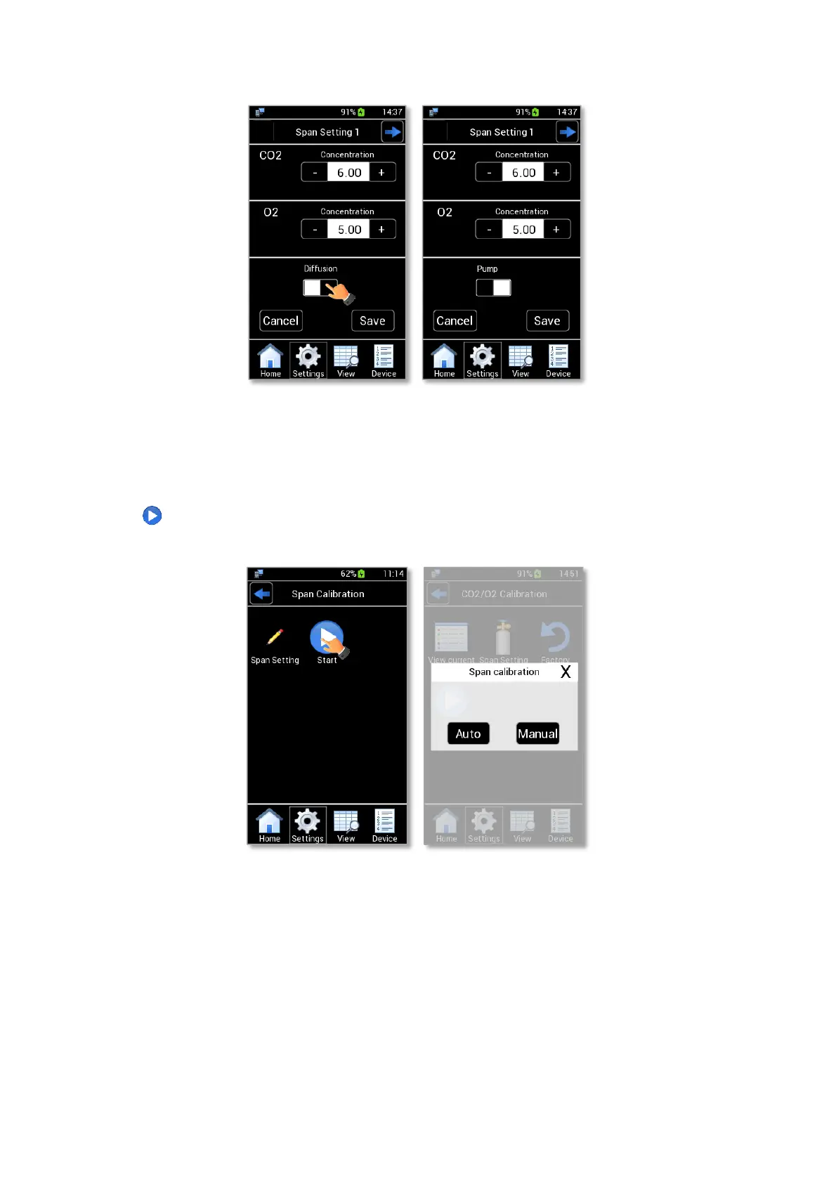 During an Auto calibration, you can see CO2 and O2 readings on the display (see Figure 86 b).