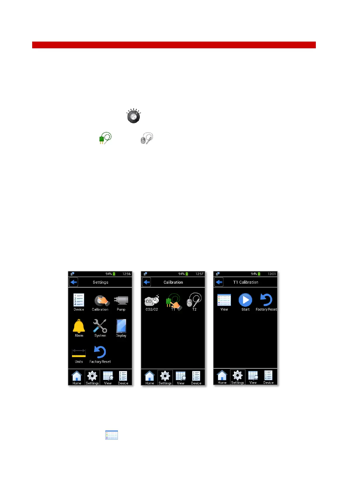 2. Press T1 icon (or T2 icon ) to access to the T1 Calibration page (or T2 Calibration page) (see