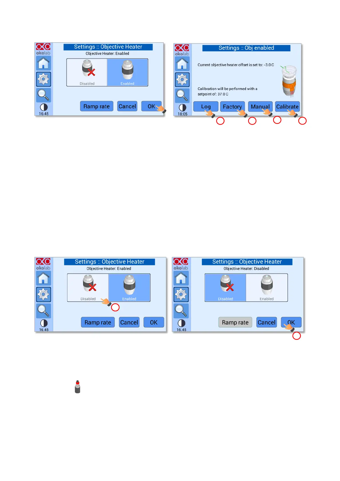 Note ► To disable the Objective Heater press on the Disabled icon (see pointer 1 in Figure 46 a) and press