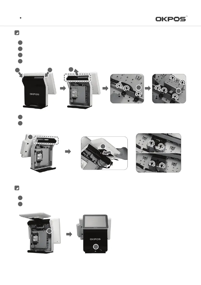 Fasten the screws after inserting dual monitor hinges into the holes of dual monitor cover like the arrow