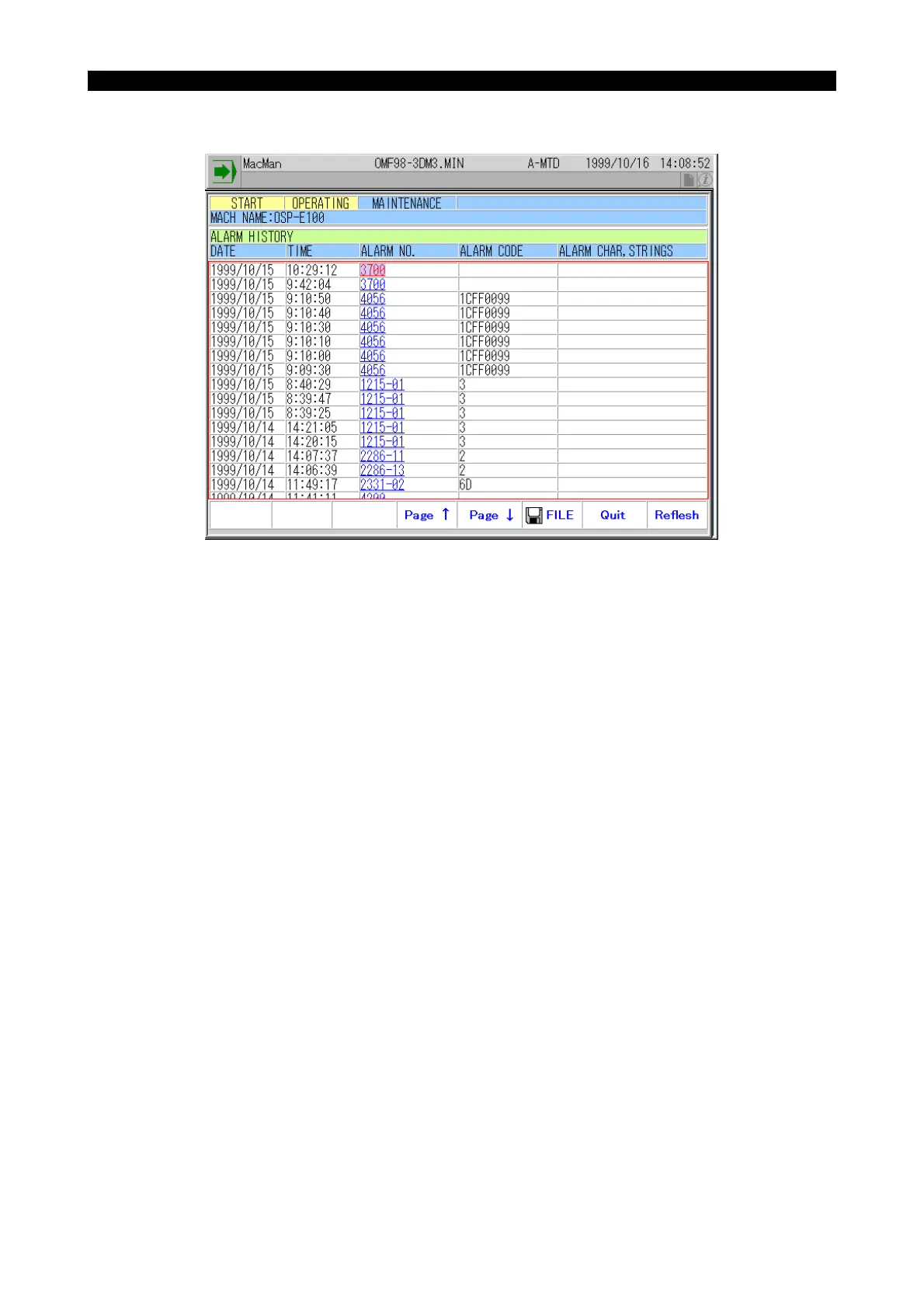 (2) On the ALARM HISTORY screen, up to 16 sets of alarm information are displayed. To view