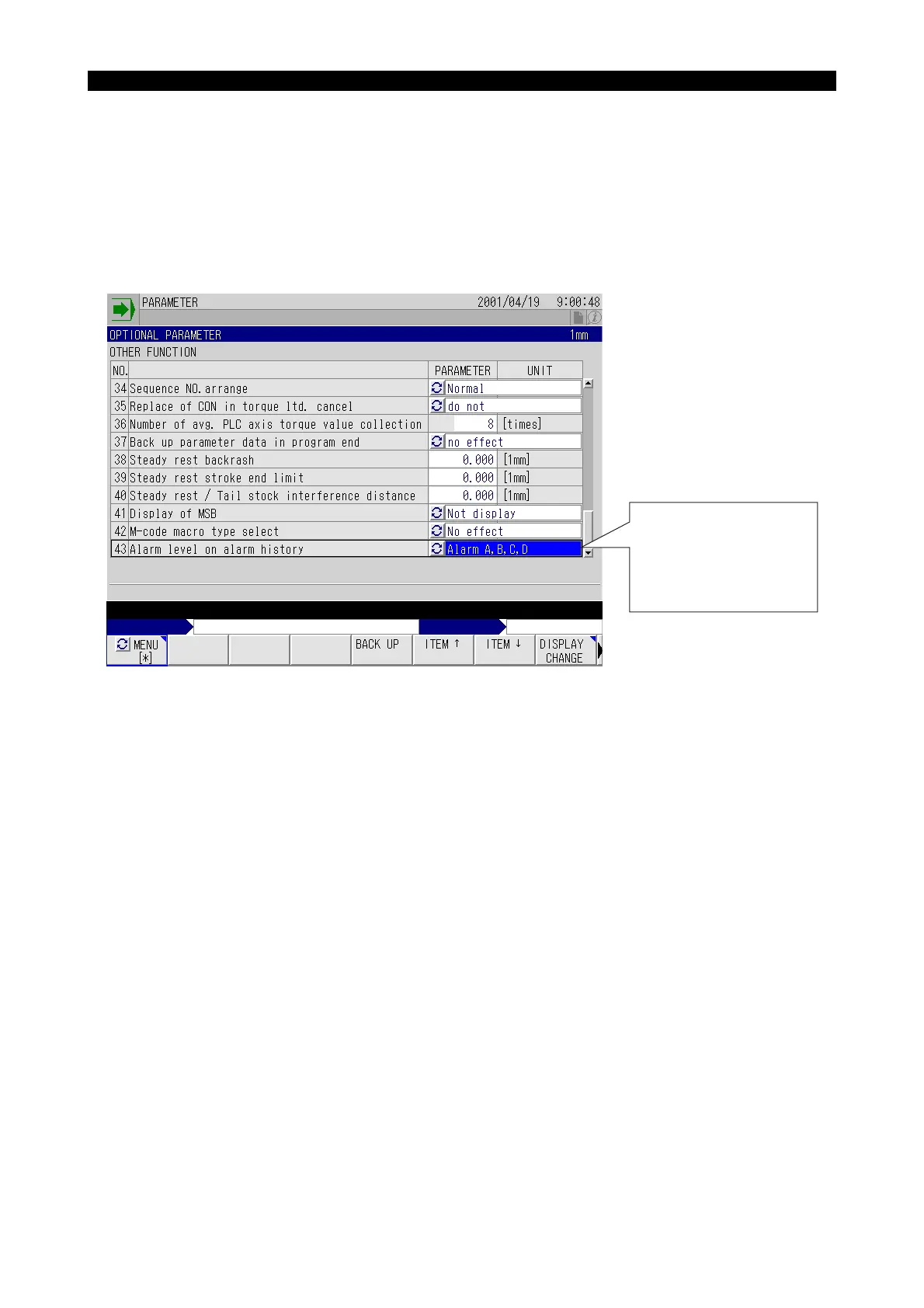 Change the alarm levels on the OPTIONAL PARAMETER (OTHER FUNCTION) screen displayed