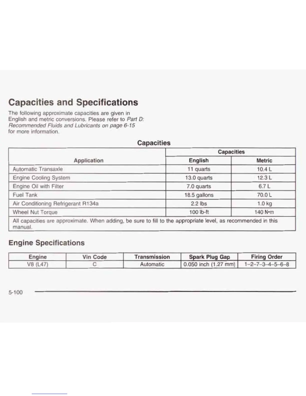 Capacities and Specifications