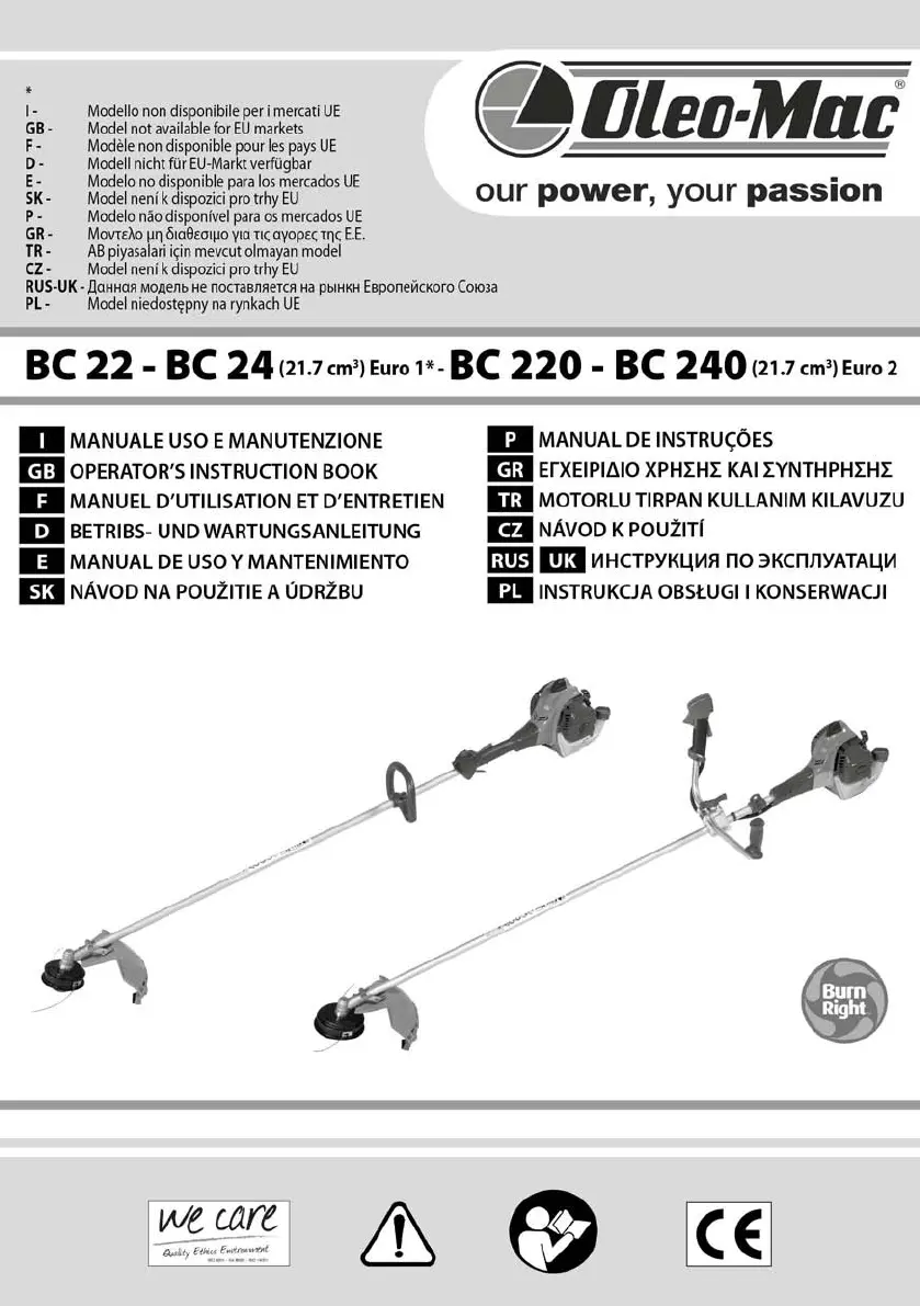 If your Oleo-Mac Trimmer engine won't start or runs only briefly, it may be due to: 1. No spark. Check for spark at the spark plug tip. If there's no spark, try again with a new spark plug (CMR7H). 2. Flooded engine. Follow the procedure on page 28. If it still won't start, repeat the procedure with a new spark plug.