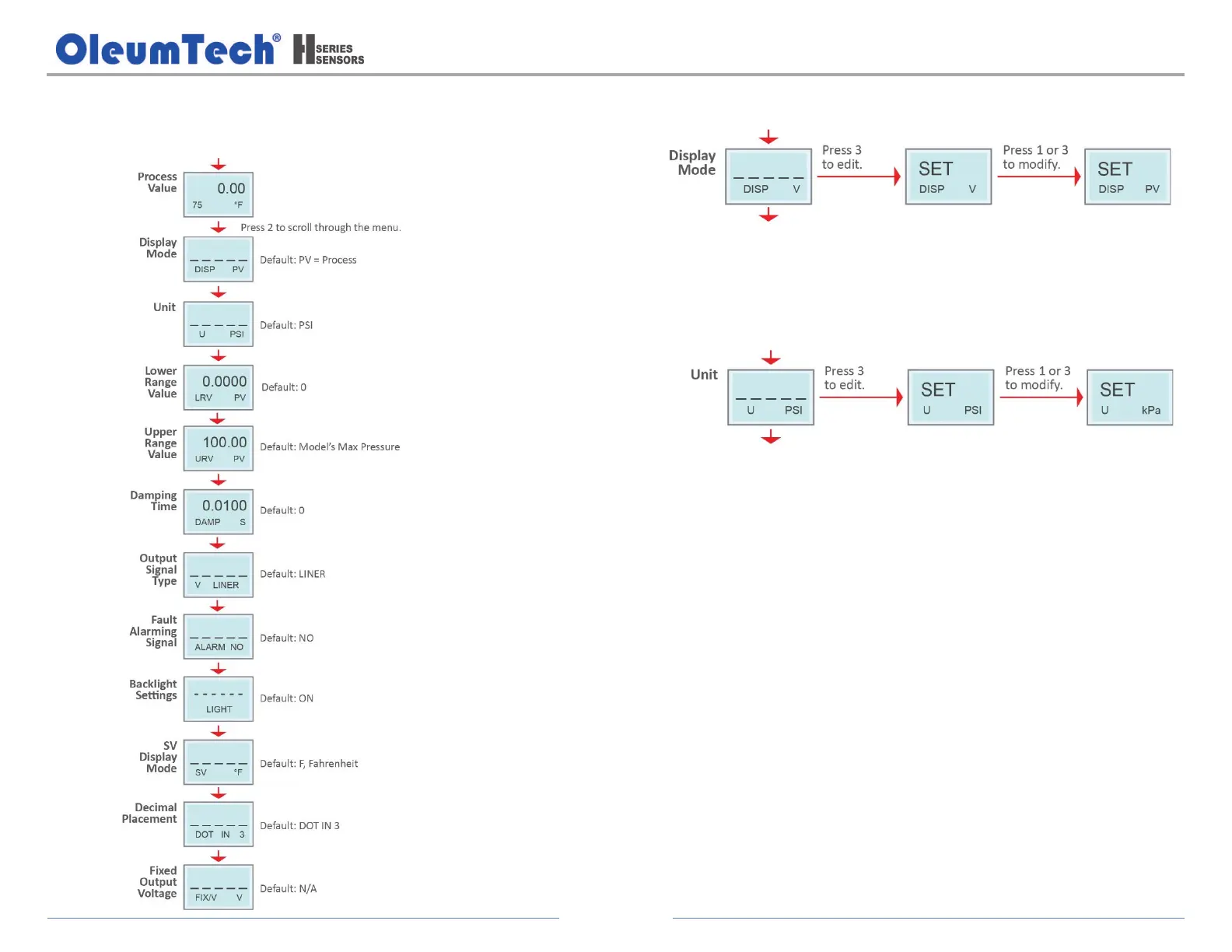 % = Percentage, PV = Pressure Value (Default), V = Voltage