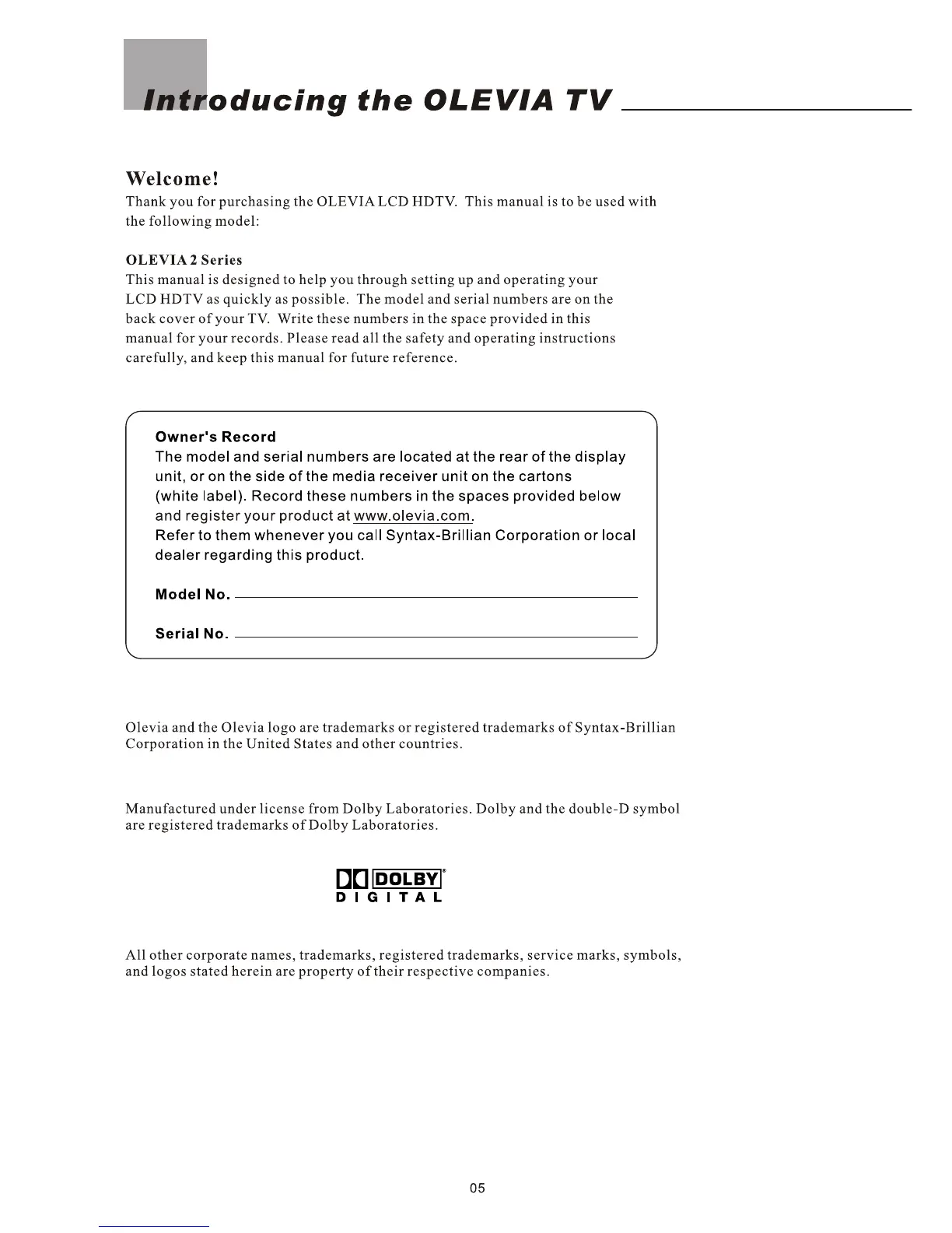 Olevia 227V - Introducing the OLEVIA TV; Owners Record and Registration