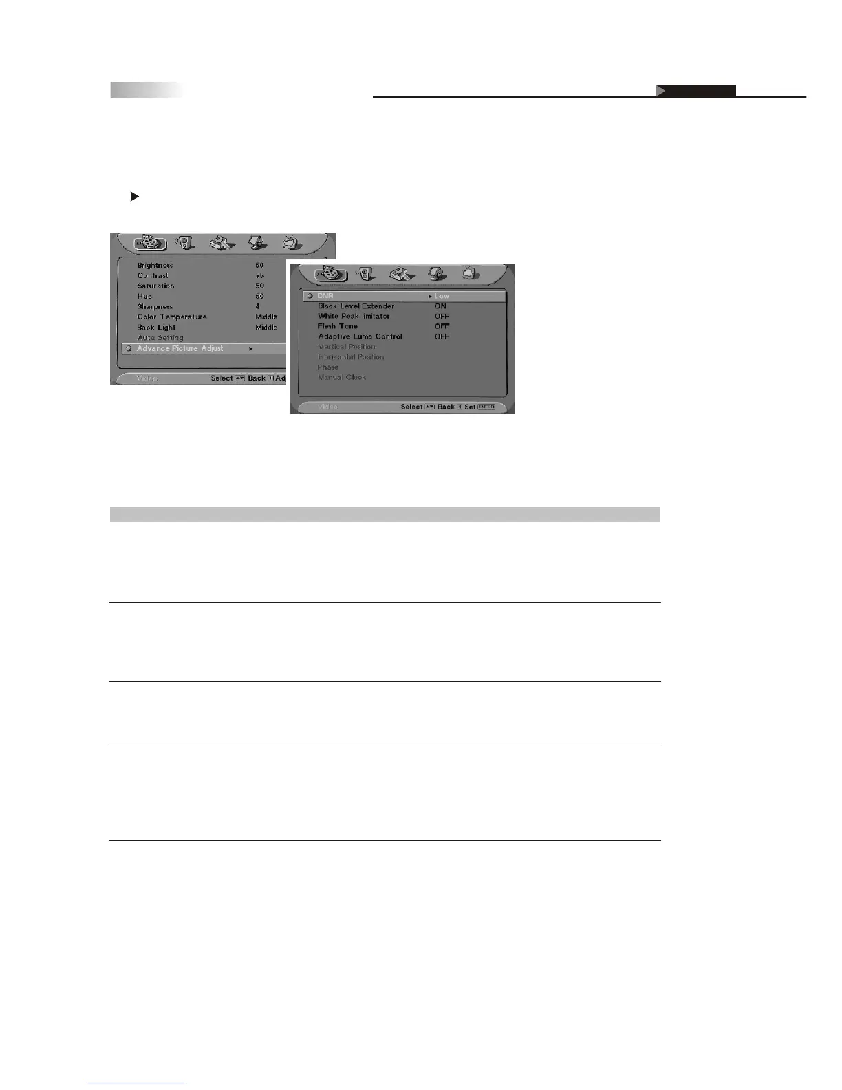 To further adjust specific picture settings, enter this function by pressing