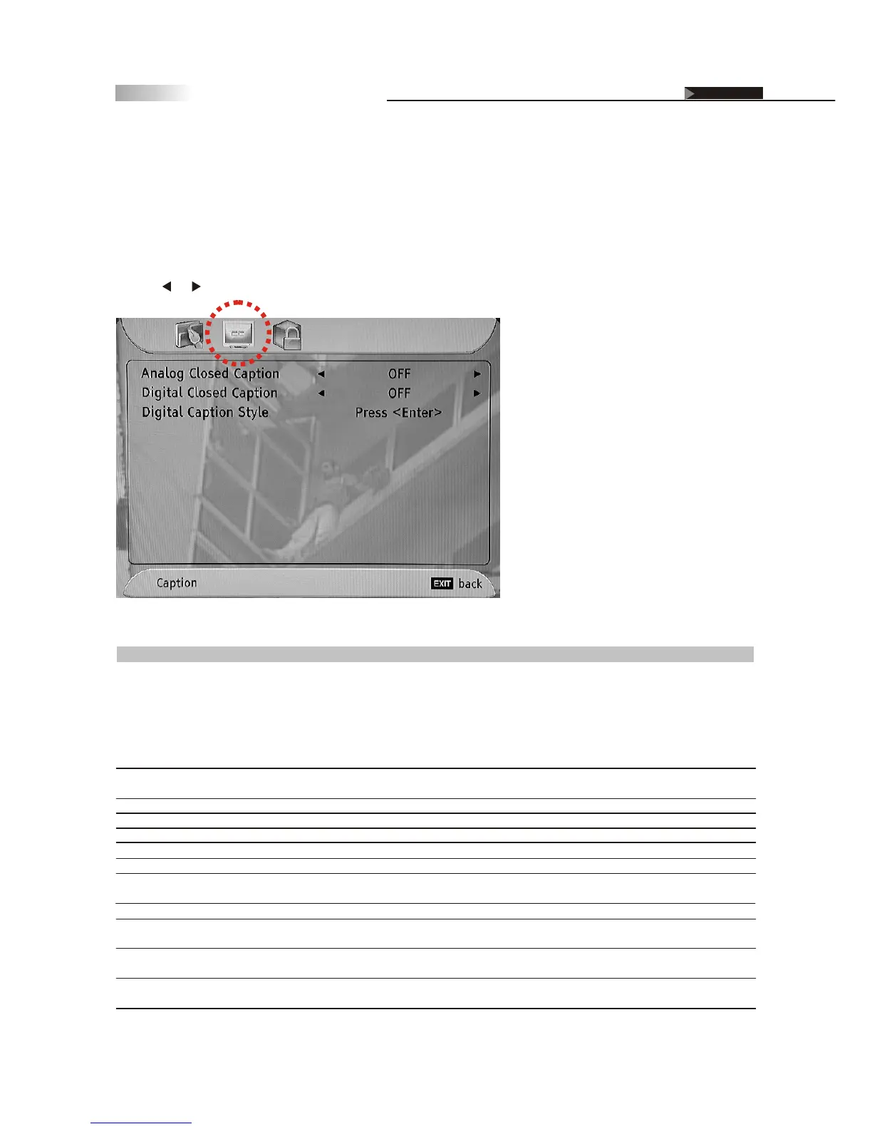 1. Press or button to highlight the "Caption" icon.