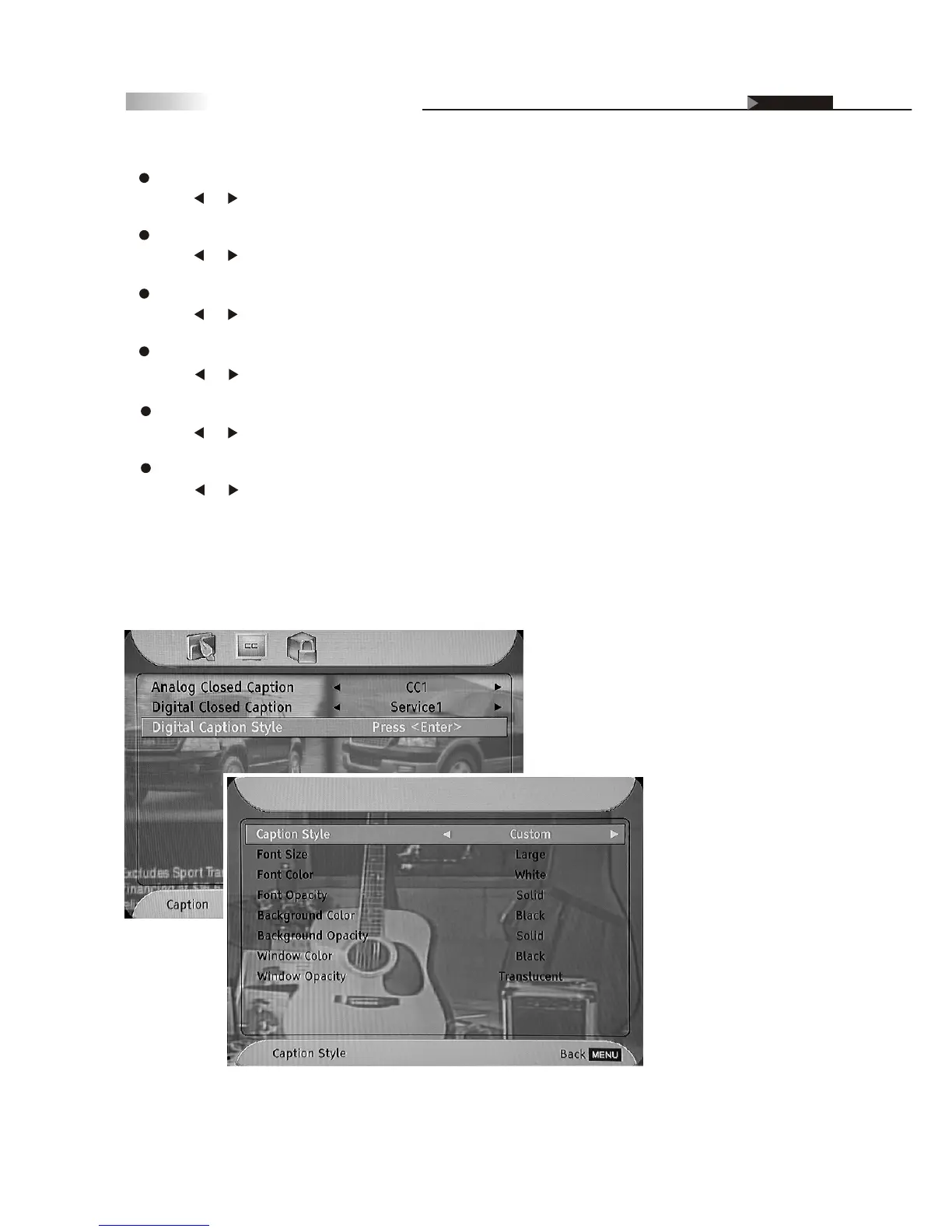 Press or button to select the font opacity degree of Closed Caption.