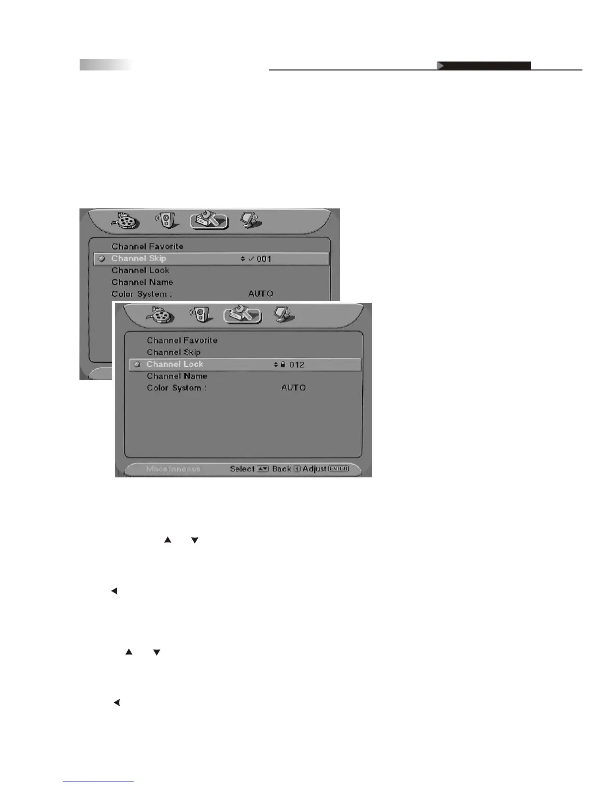 2.Enter the channel number you wish to skip or lock, or scroll through