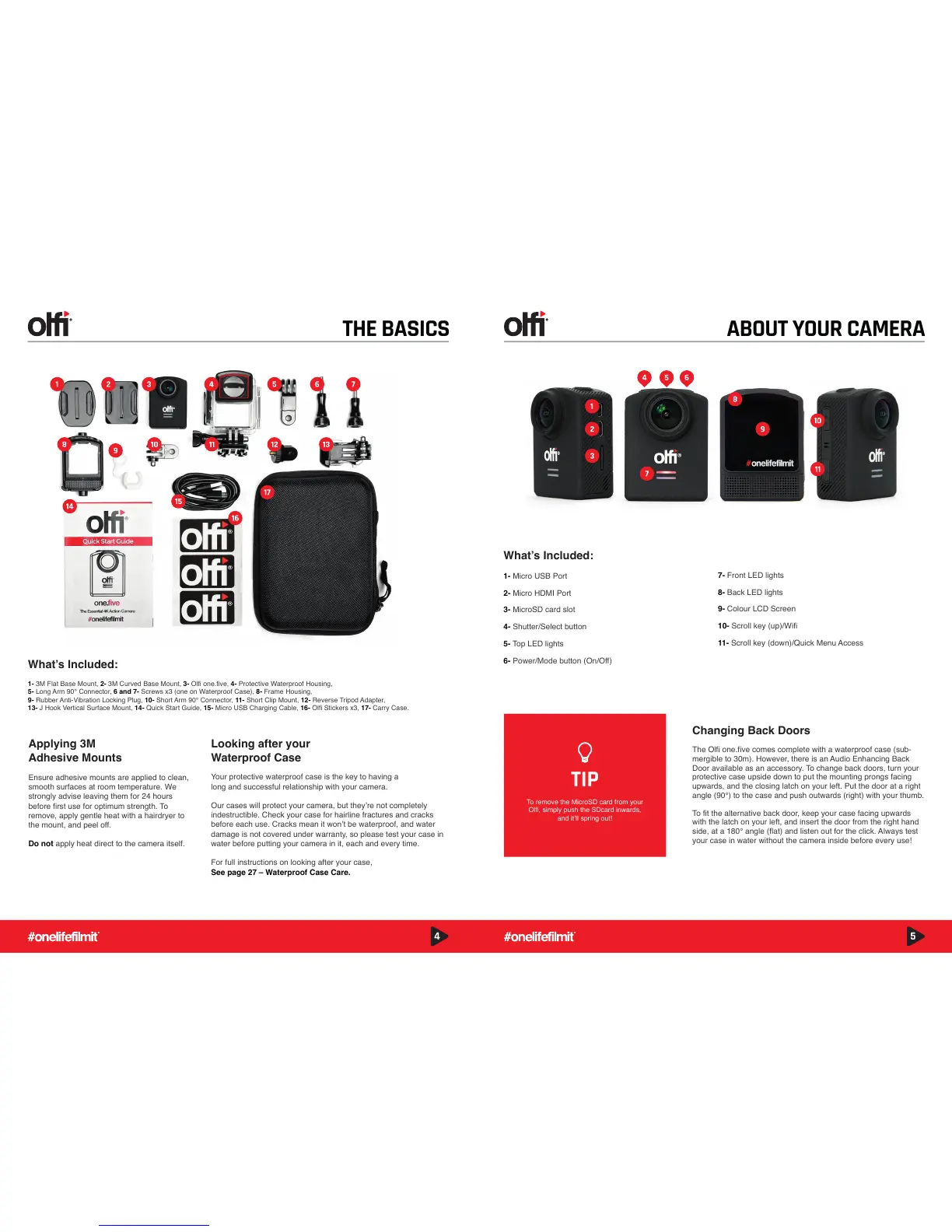 13- J Hook Vertical Surface Mount, 14- Quick Start Guide, 15- Micro USB Charging Cable, 16- Olfi Stickers x3, 17- Carry Case.