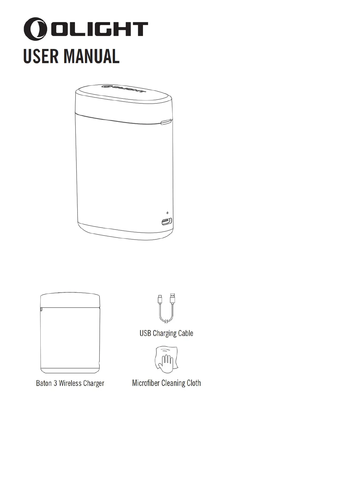 OLIGHT Baton 3 - In The Box; Baton 3 Wireless Charger; USB Charging Cable; Microfiber Cleaning Cloth