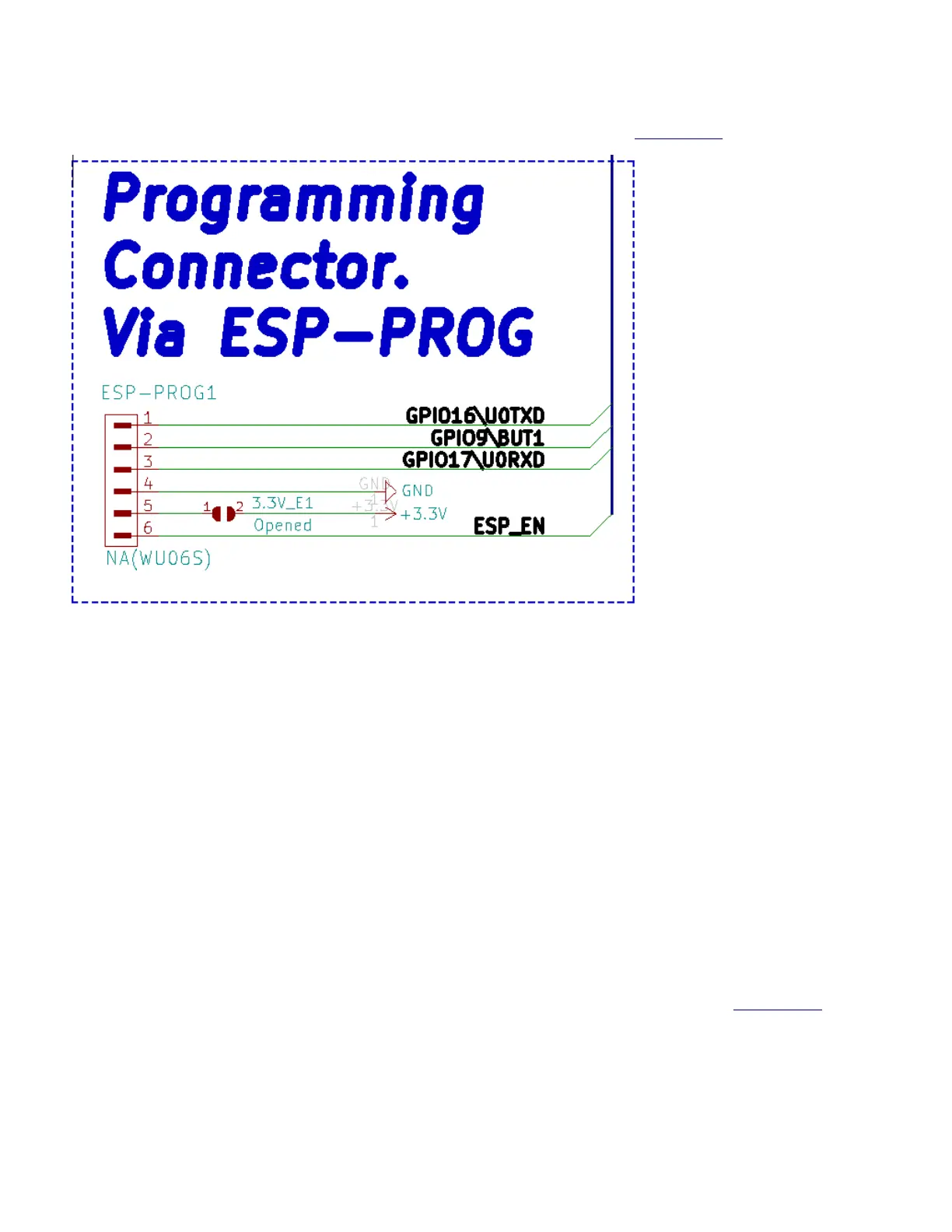 3.3V_E1 – enable 3.3V input on pin #5 of ESP-PROG1 connector – risky to leave 3.3V on the ESP-PROG1
