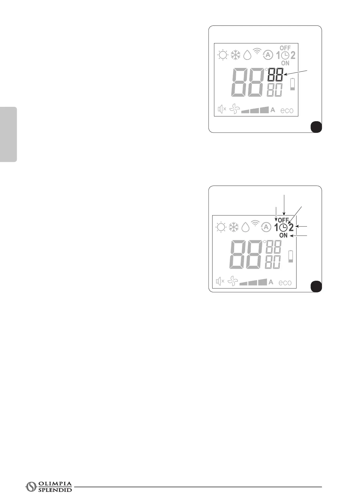 e. Press key B9 (SET TIMER) again; symbol 2 (D9) (Activation time of the 2° program) and symbol ON