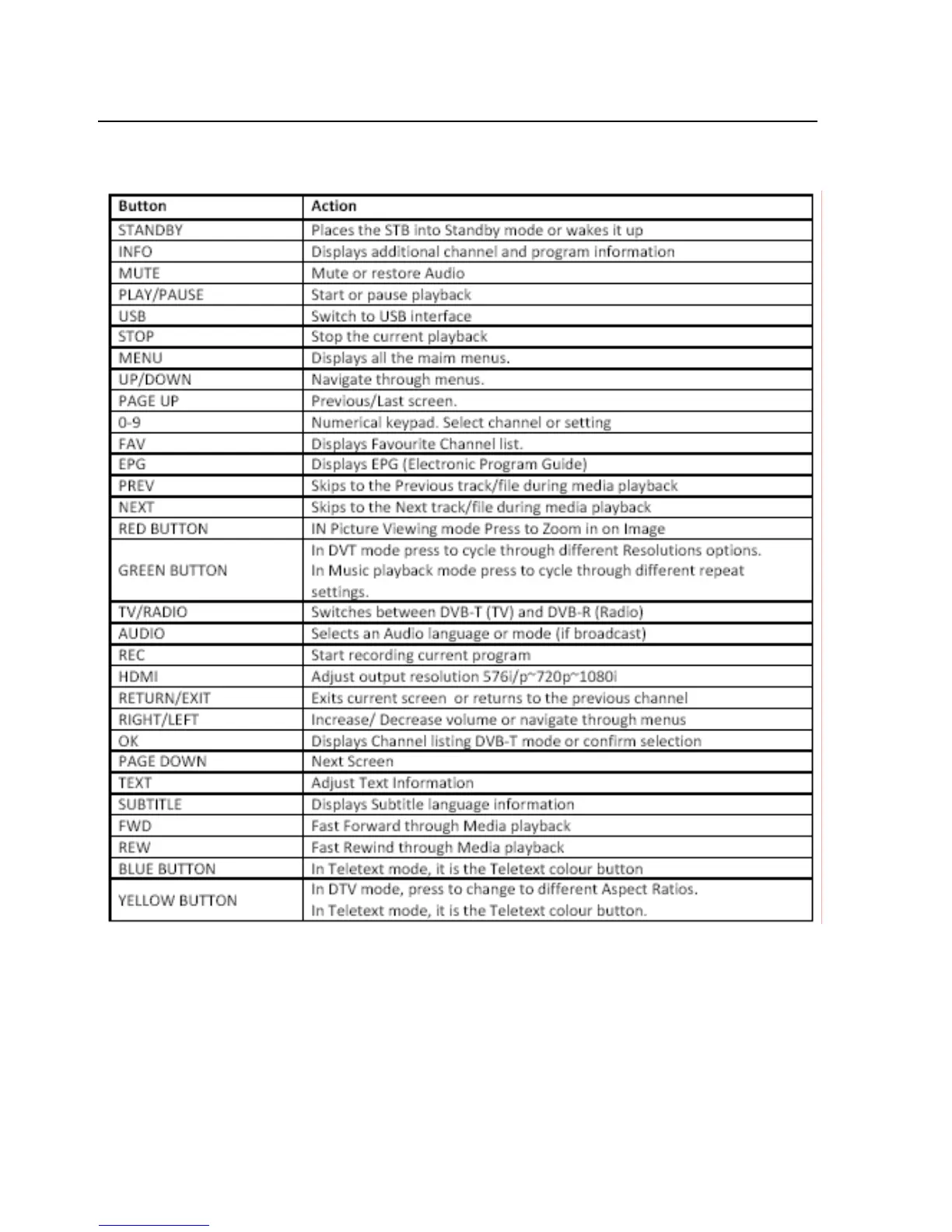 Olin HVBTR1600U - Remote Control Button Functions