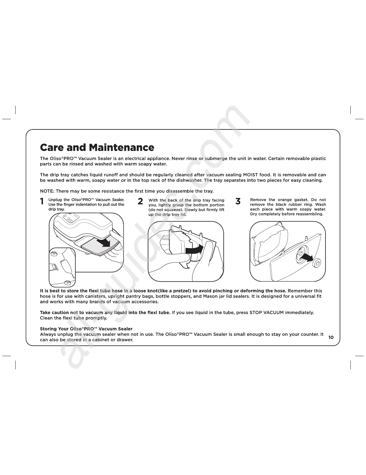 Oliso PRO Series - Care and Maintenance; Cleaning the Drip Tray; Storing the Flexi Tube Hose; Storing the Vacuum Sealer