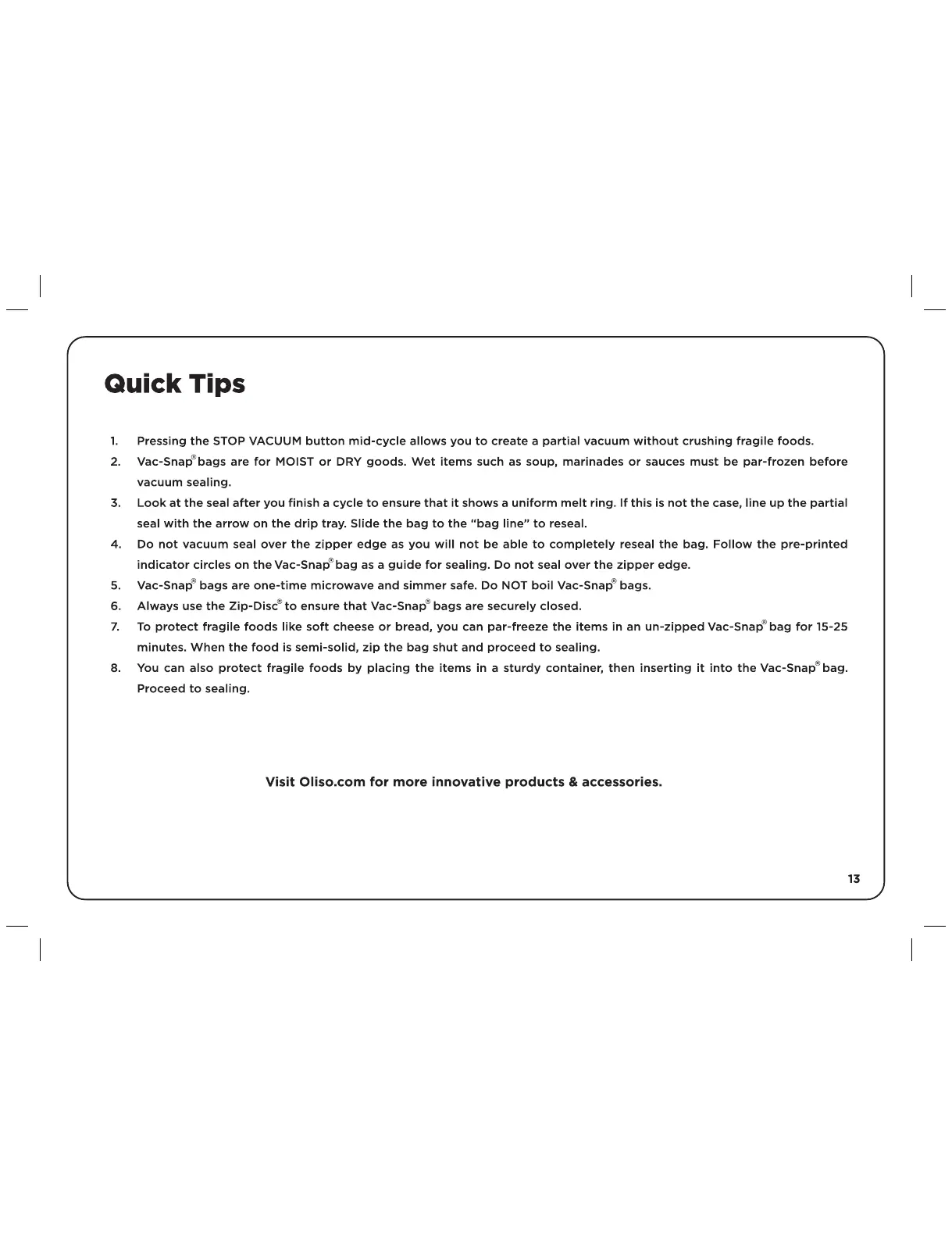 Oliso PRO Series - Quick Tips for Vacuum Sealing; Creating Partial Vacuums; Handling Wet Items; Ensuring a Uniform Melt Ring