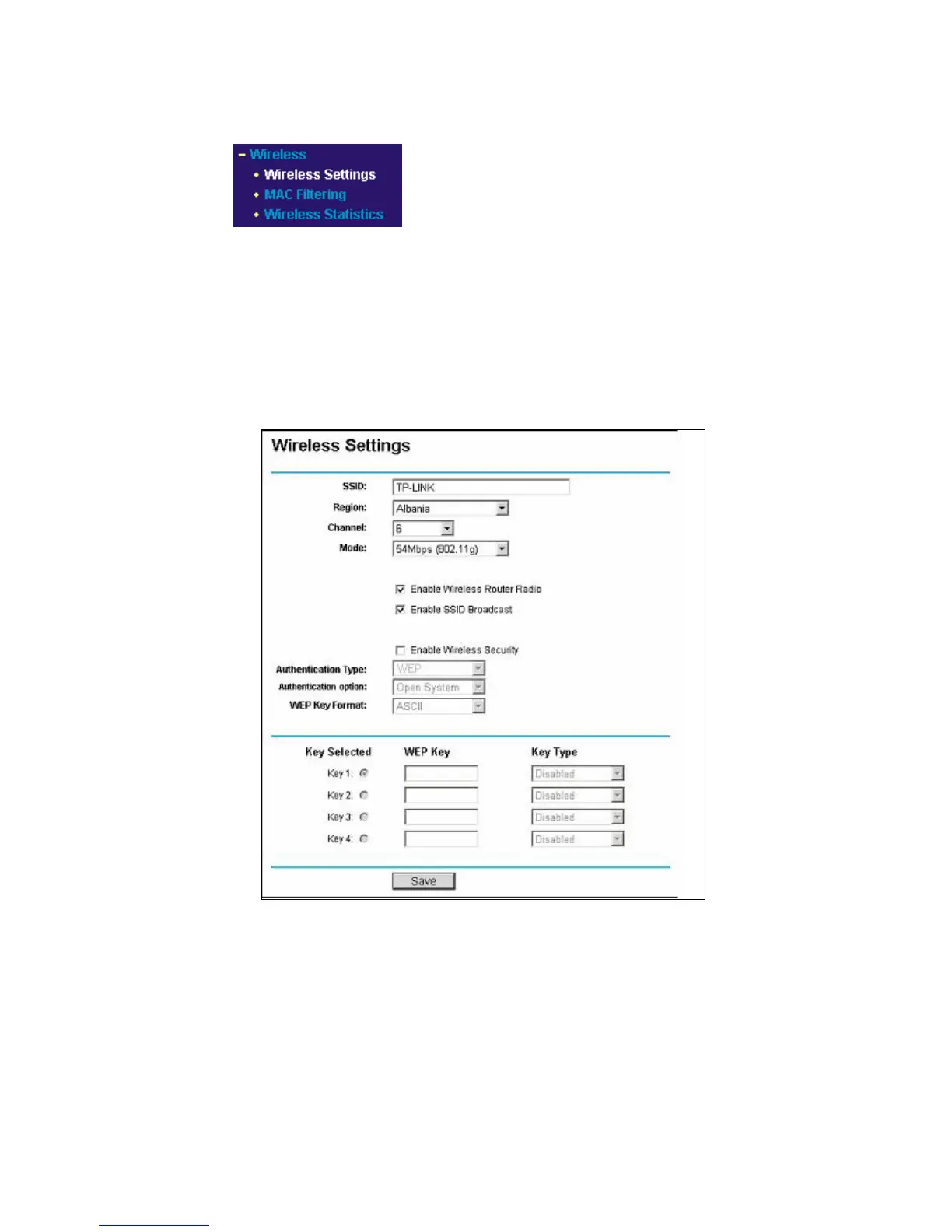 Settings, MAC Filtering and Wireless Statistics. Click any of them, and you will be