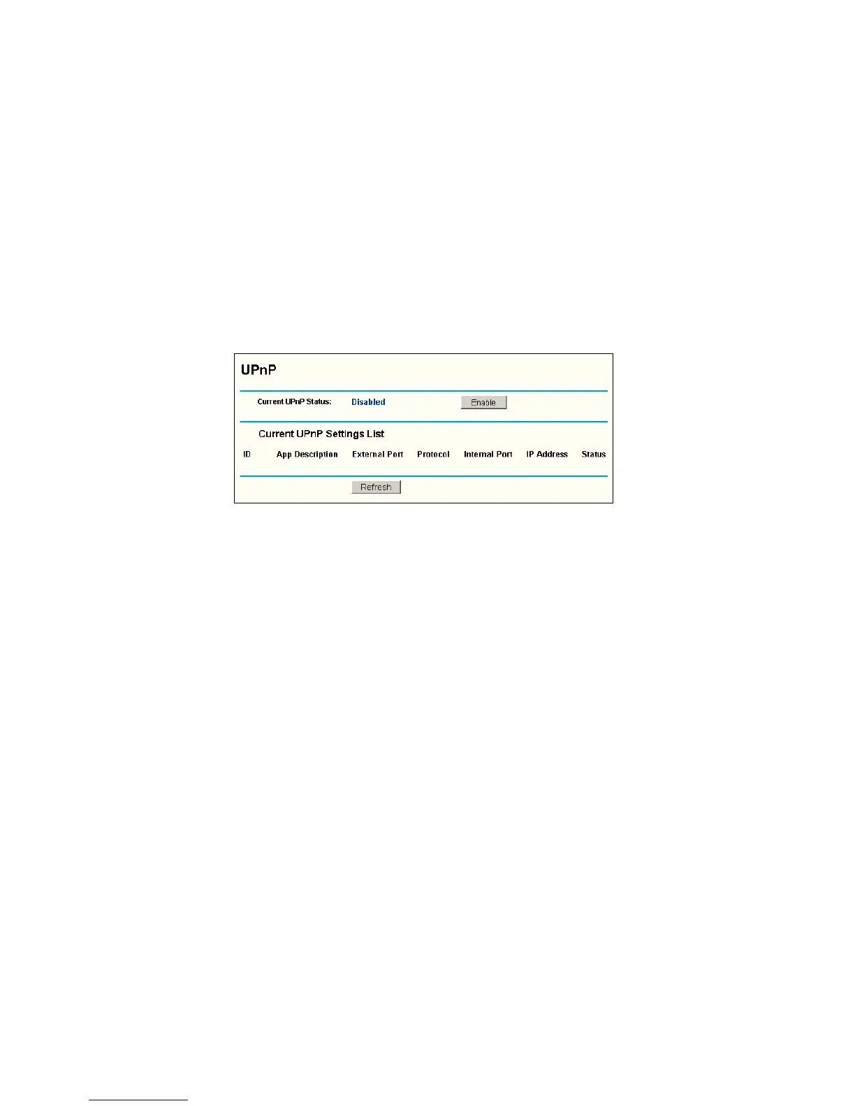 ¾ Current UPnP Settings Table - this table displays the current UPnP information.