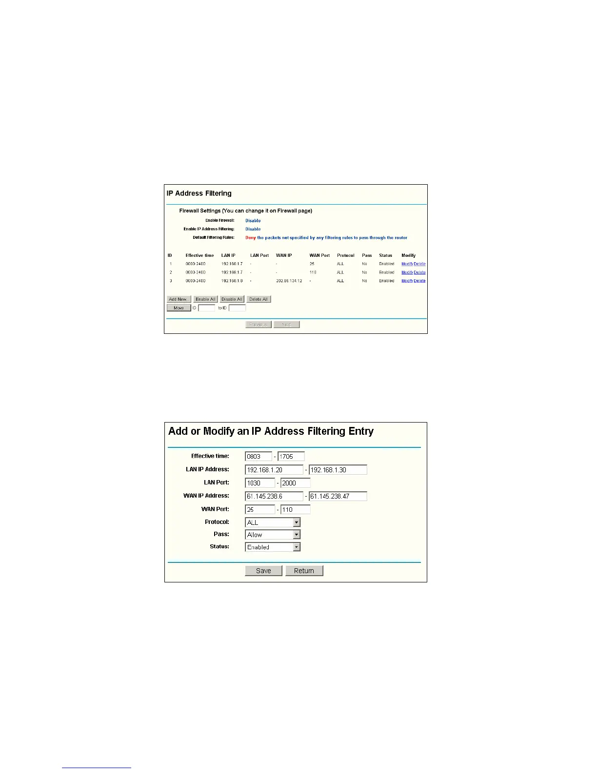 on your LAN based on their IP addresses. The IP address filtering are set on this page,