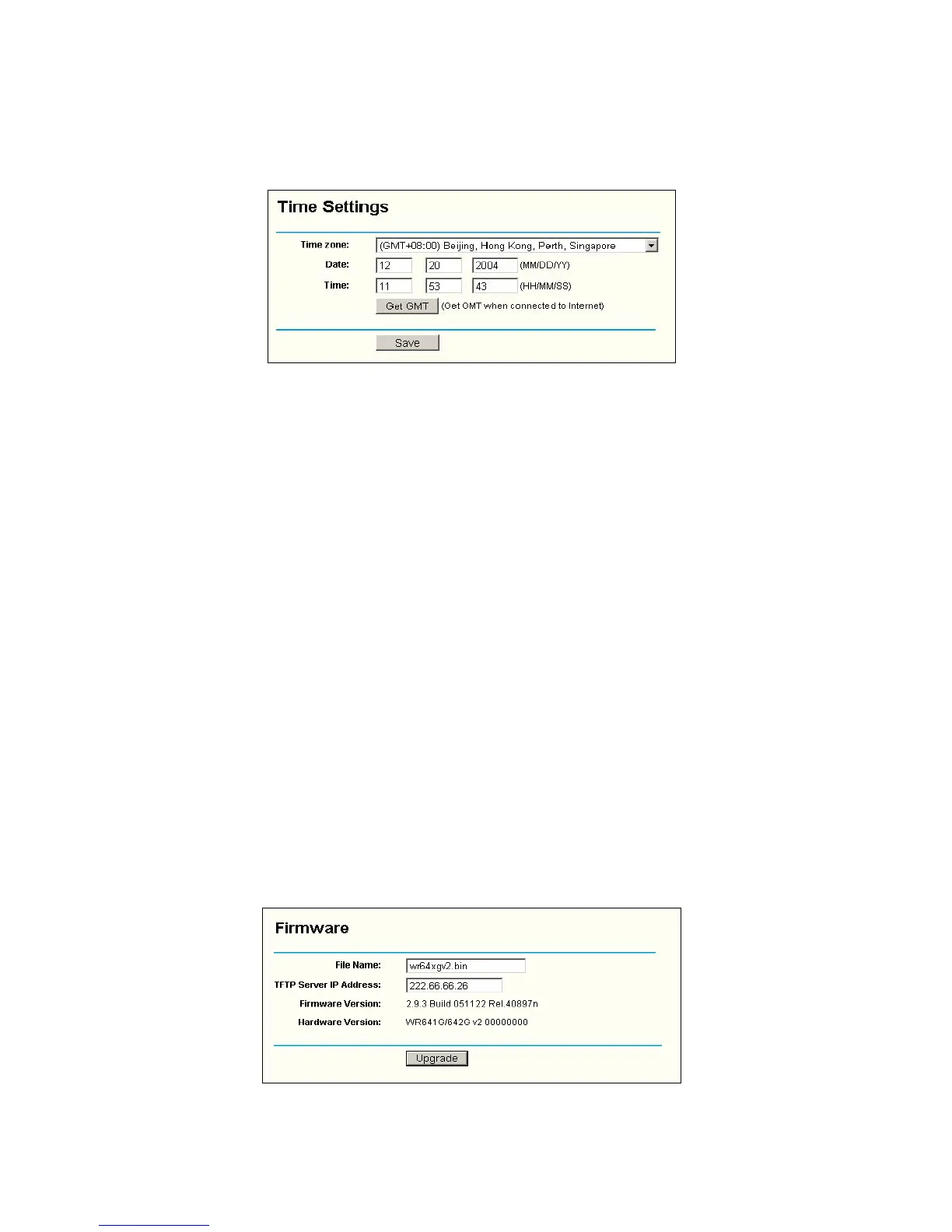You can set time manually or get GMT from the Internet for the router on this page
