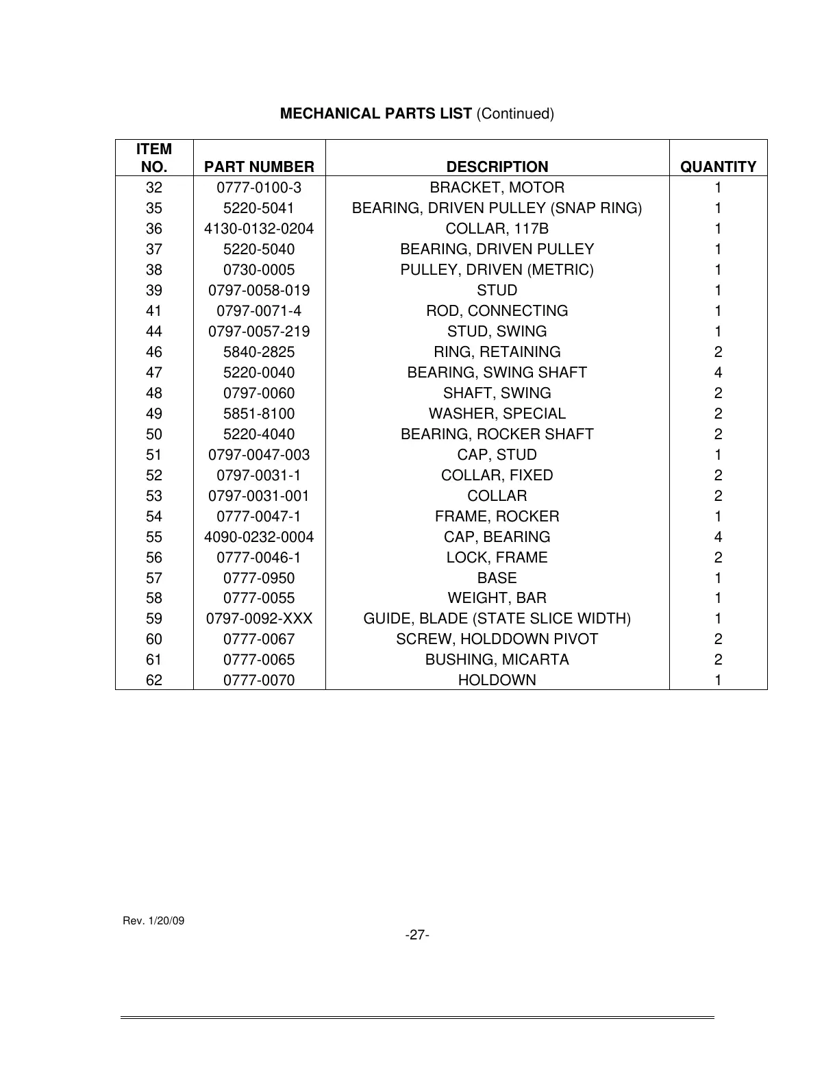 MECHANICAL PARTS LIST (Continued)