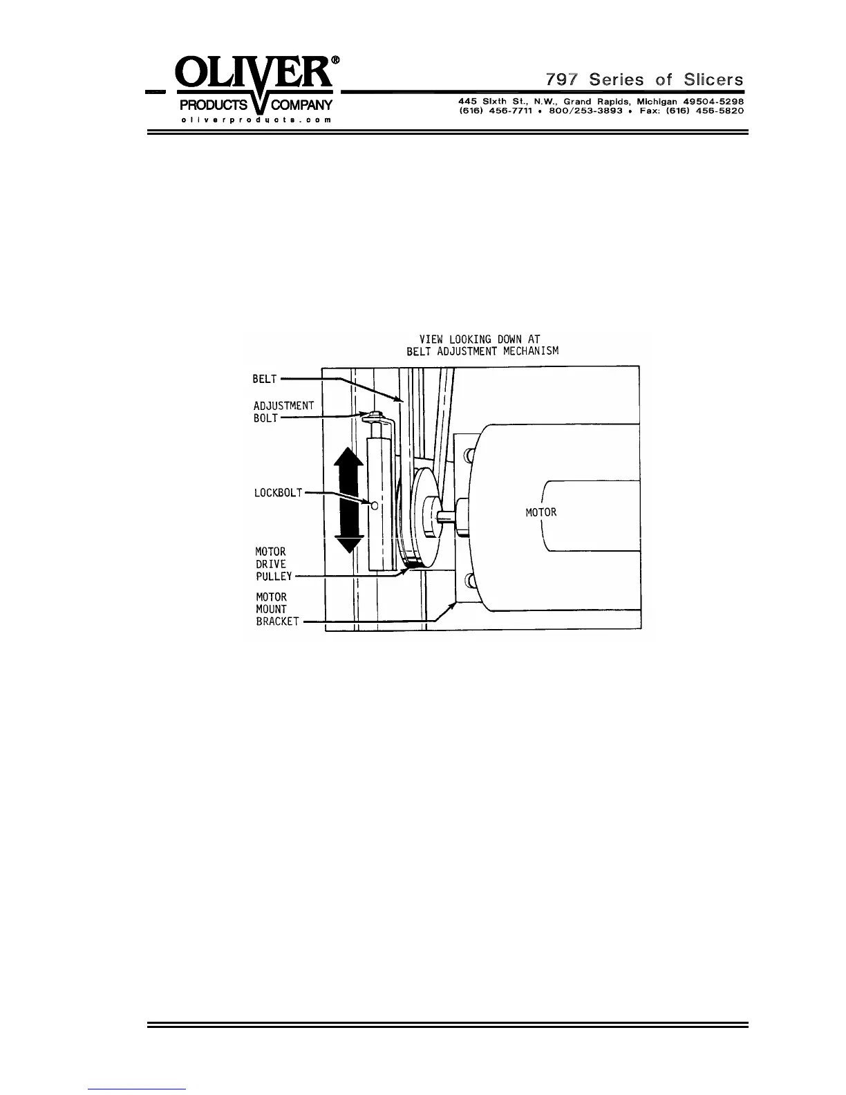 illustration. Locate the adjustment bolt below the belt and turn it counter clockwise with