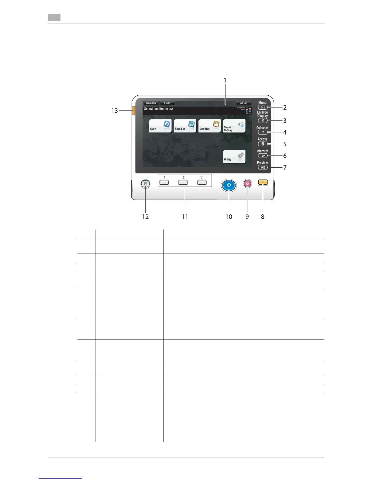 1 Touch Panel Various screens and messages are displayed. Directly touch the