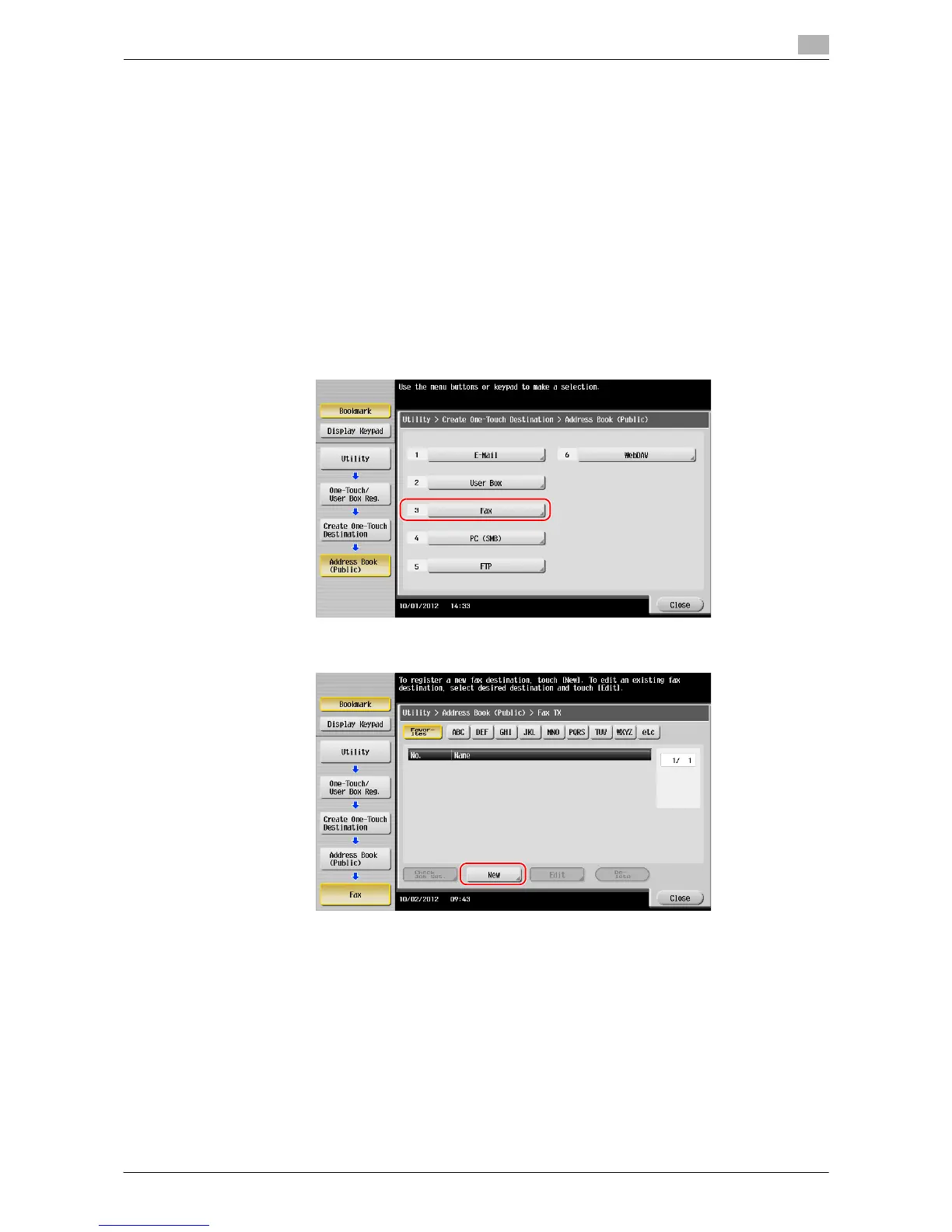 1 Tap [Utility], and select [One-Touch/ User Box Reg.] - [Create One-Touch Destination] - [Address Book