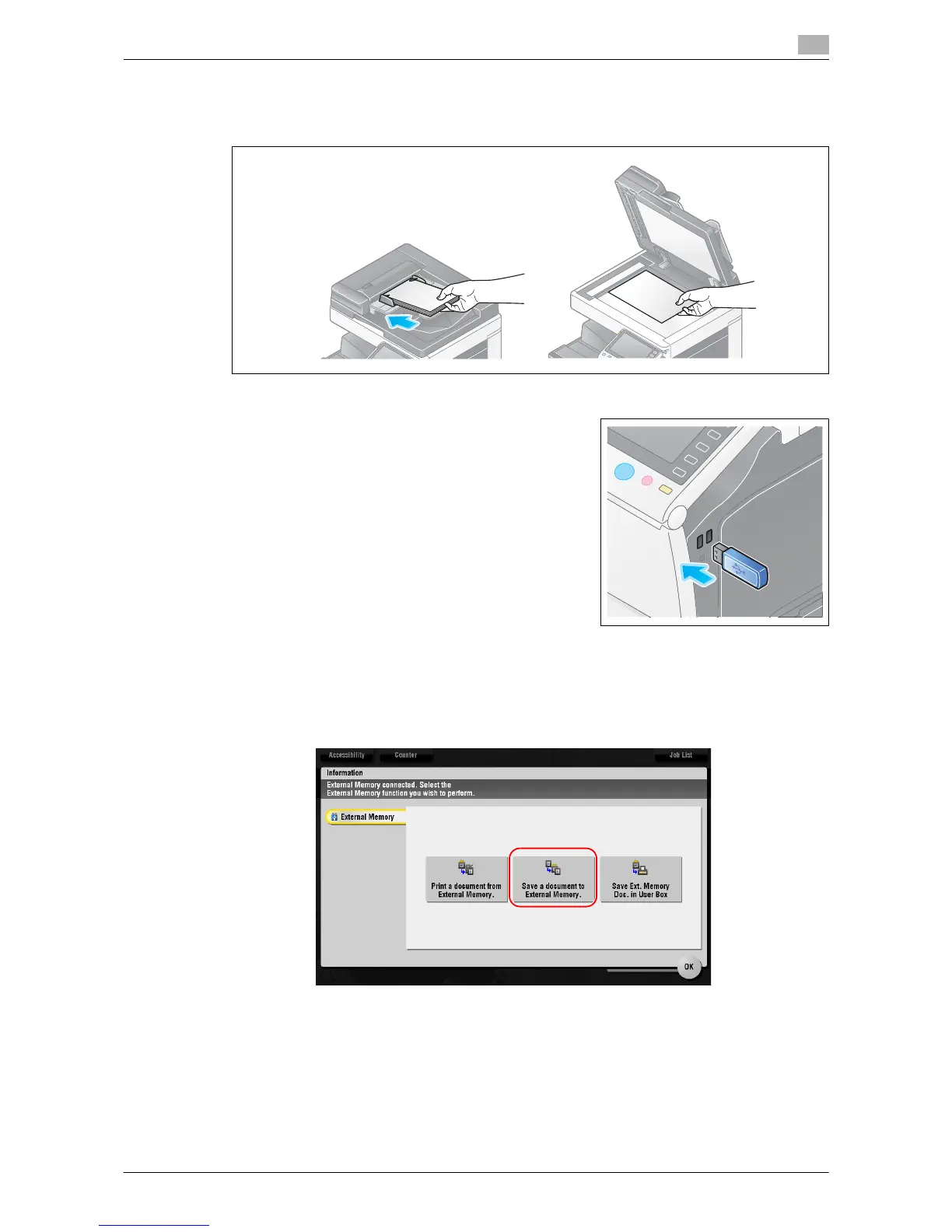 Do not insert the USB memory device into the USB port close to the rear panel of this machine.