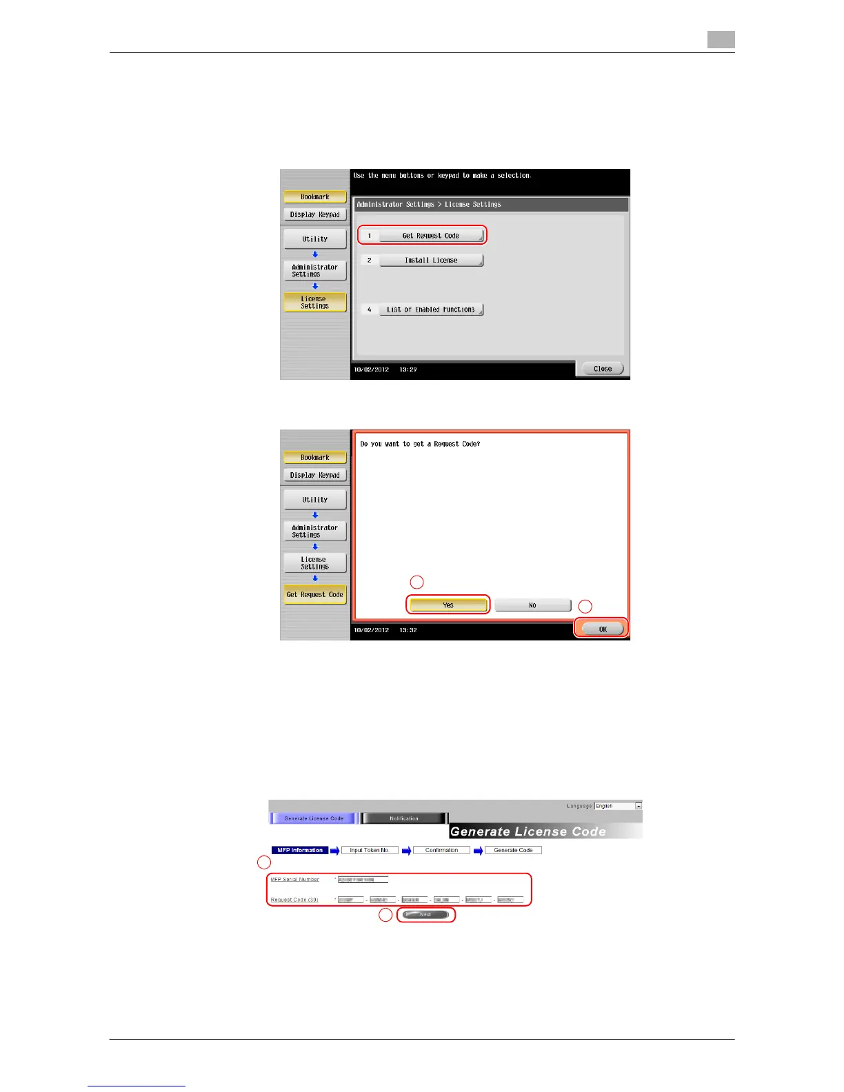 1 Tap [Utility], and select [Administrator Settings] - [Forward] - [License Settings] - [Get Request Code].