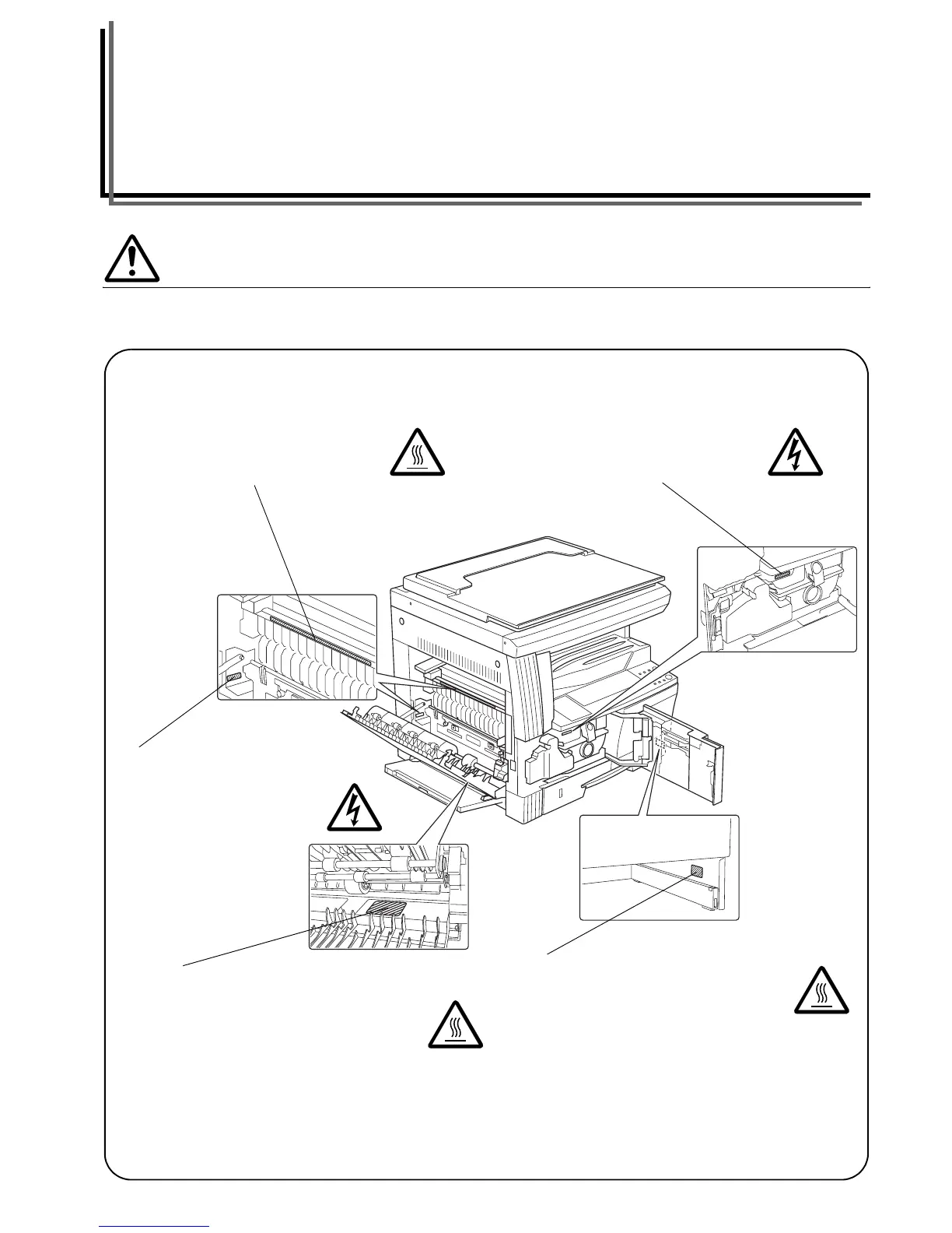 warnings to prevent accidents such as burns and electrical shock while clearing paper misfeeds and adding toner.