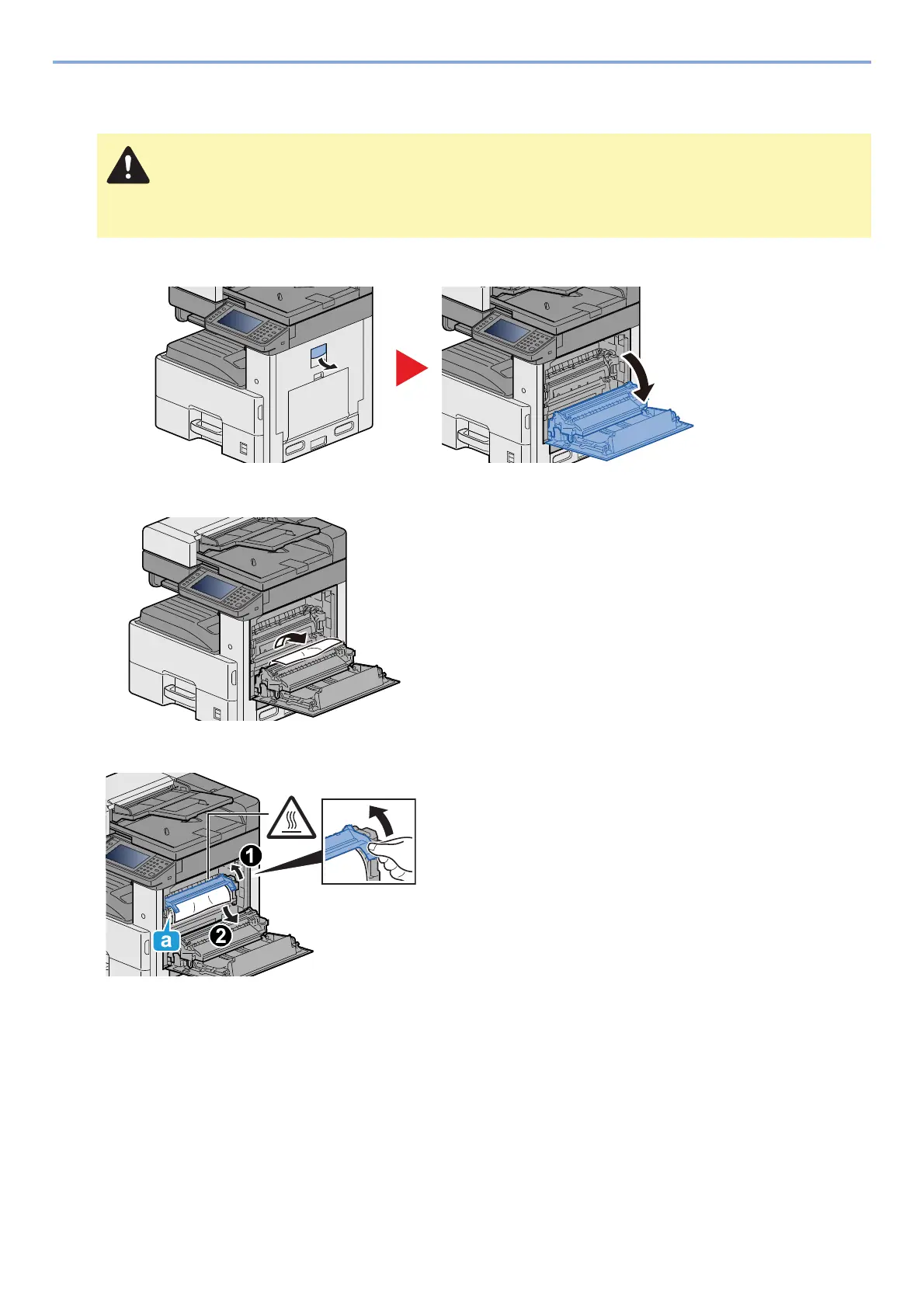 The fixing unit is extremely hot. Take sufficient care when working in this area, as there is a danger of