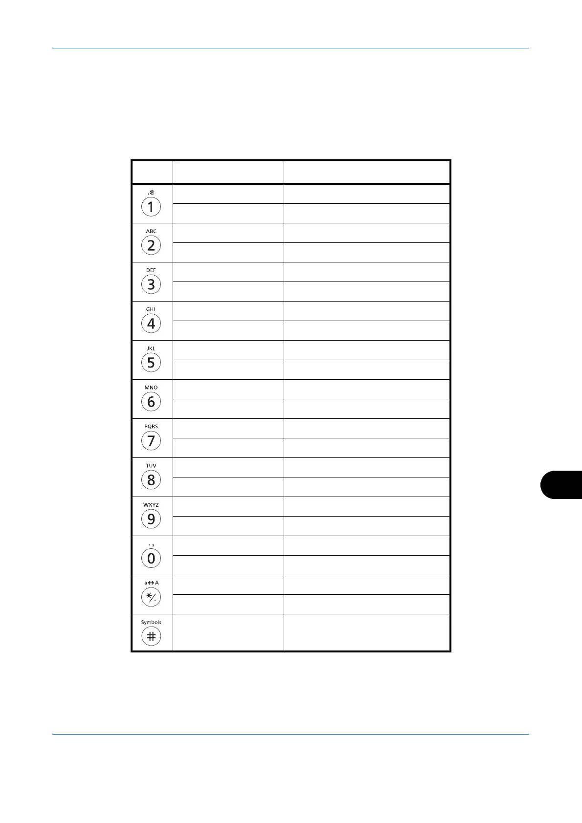 Referring to the table below, press the key corresponding to the character you want to enter until it is displayed.
