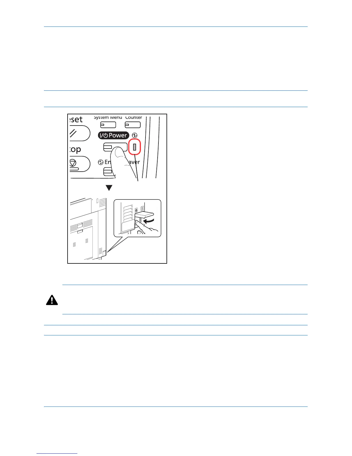 Before turning off the main power switch, press the Power key on the operation panel to off. Make sure that the