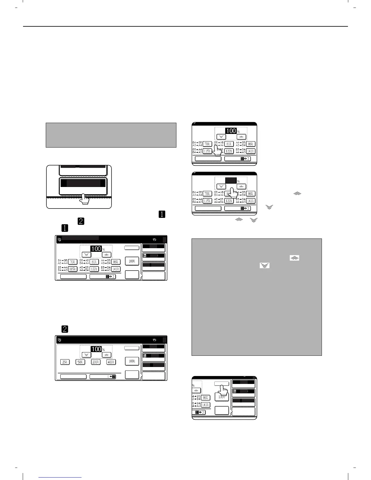 Preset ratios (maximum 400%, minimum 25%) can be selected with the enlargement and reduction keys. In addition,