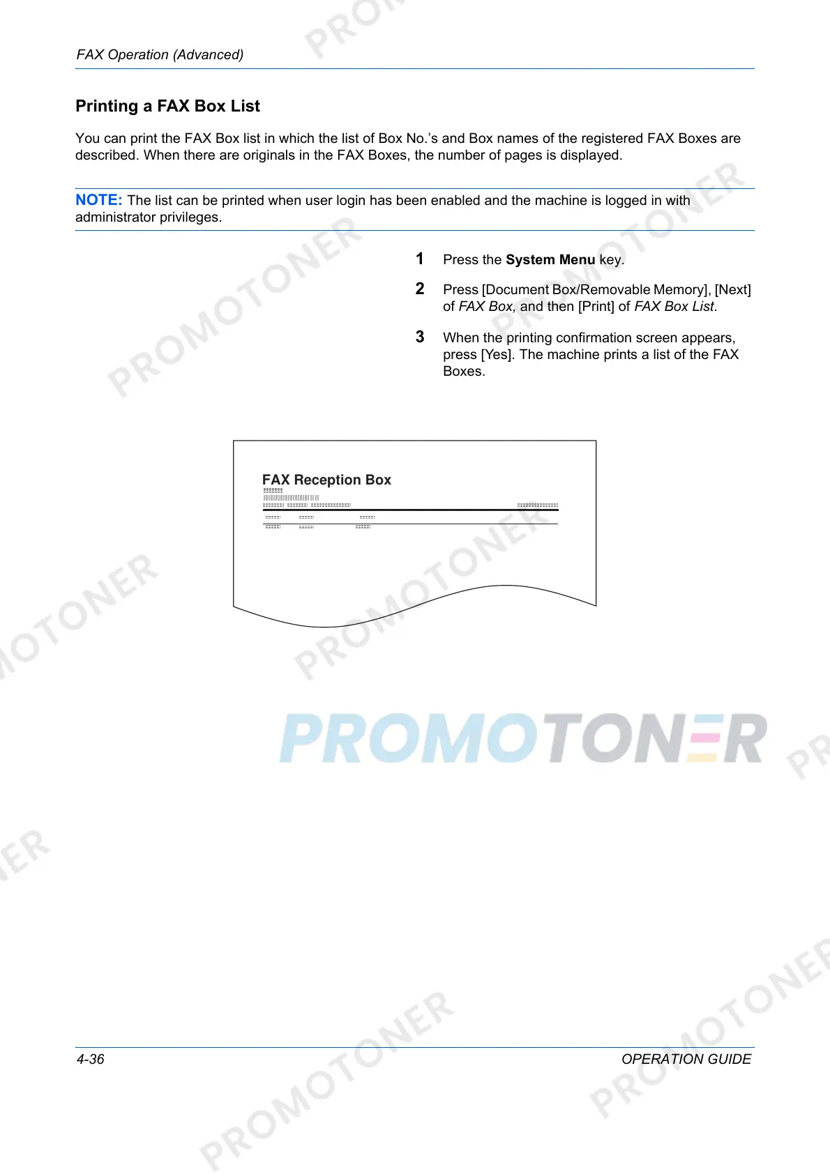 You can print the FAX Box list in which the list of Box No.’s and Box names of the registered FAX Boxes are