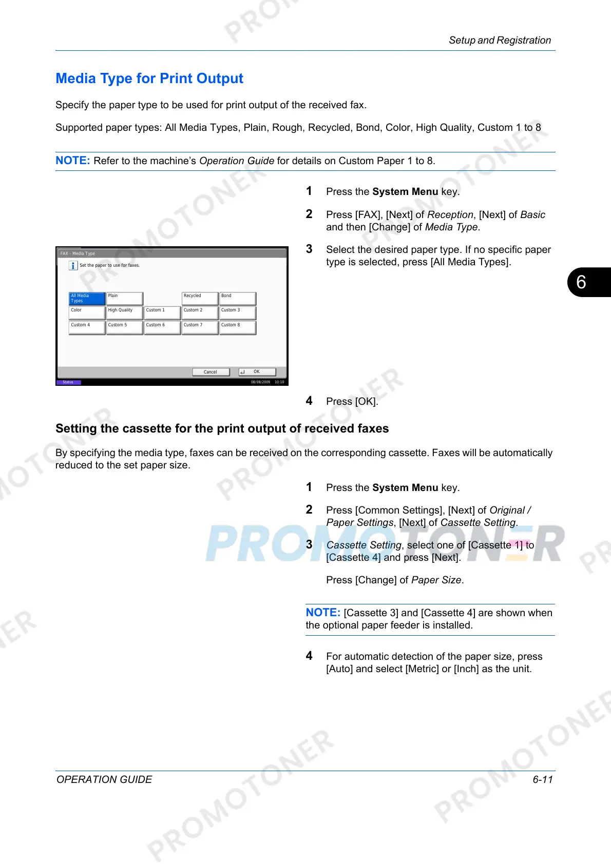 By specifying the media type, faxes can be received on the corresponding cassette. Faxes will be automatically
