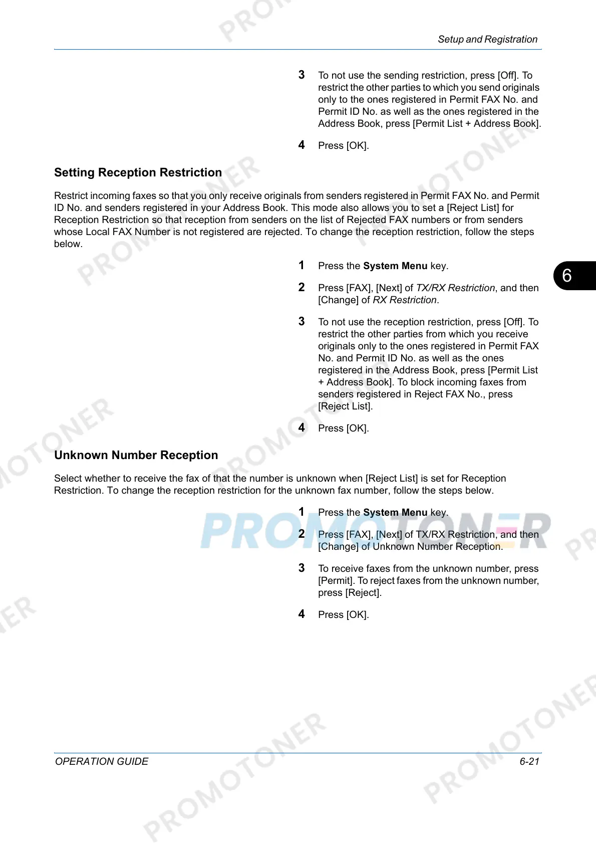 Restriction. To change the reception restriction for the unknown fax number, follow the steps below.