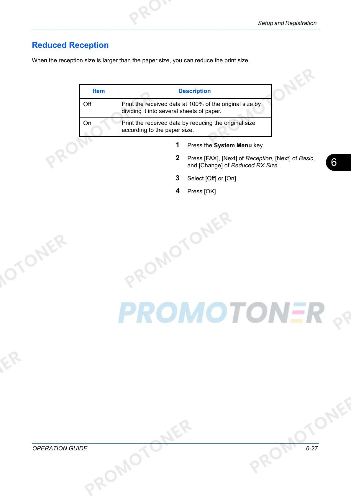 When the reception size is larger than the paper size, you can reduce the print size.