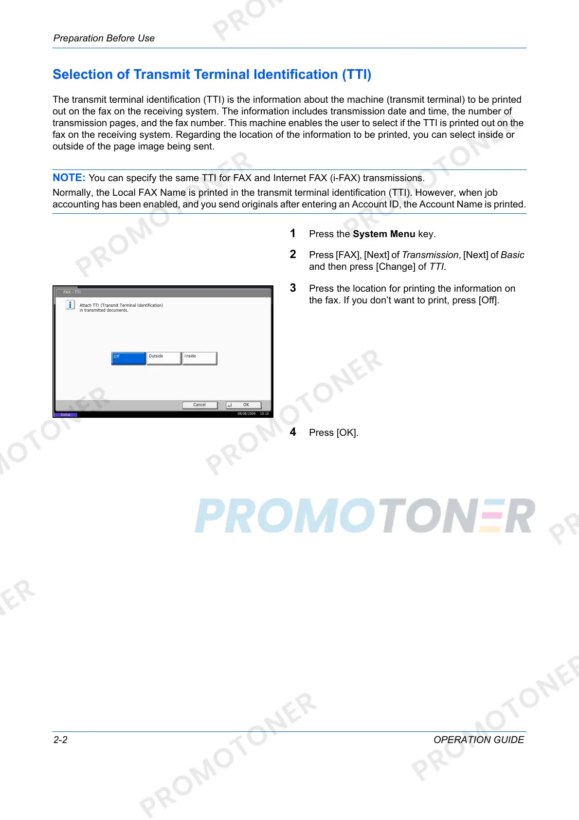 NOTE: You can specify the same TTI for FAX and Internet FAX (i-FAX) transmissions.